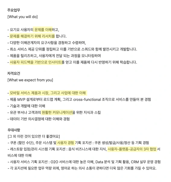 다음은 너무나 유명한 배달음식 주문 플랫폼이죠. 딜리버리히어로 코리아의 배달 서비스 **'요기요'**의 프로덕트 오너 채용 공고를 같이 살펴보도록 할게요. �