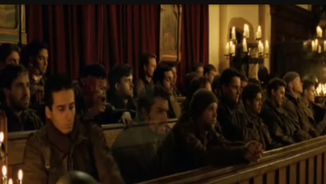 <밴드 오브 브라더스>에도 비슷한 장면이 나온다. 바스토뉴 전투에서 절반 이상의 사상자를 낸 이지(Easy) 중대는 어느 교회에서 성가대가 불러주는 '사랑의 기쁨'을 들으며 밤을 보낸다. 전사자 목록을 작성하는 립튼 상사의 눈에 불현듯 꿈처럼 교회 회중석에 앉은 모든 중대원들이 보인다. 쓰러지기 전의 온전한 육신과 표정으로 그들은 정답게 쉬고 있다. 그러나, 머물고 싶은 그 순간은 바람처럼 지나가고 하나씩, 하나씩, 죽은 자들은 유령처럼 빈 공간을 남기고 사라진다. 남은 것은 드문드문 앉아있는 피로에 지친 산자들 뿐이다.