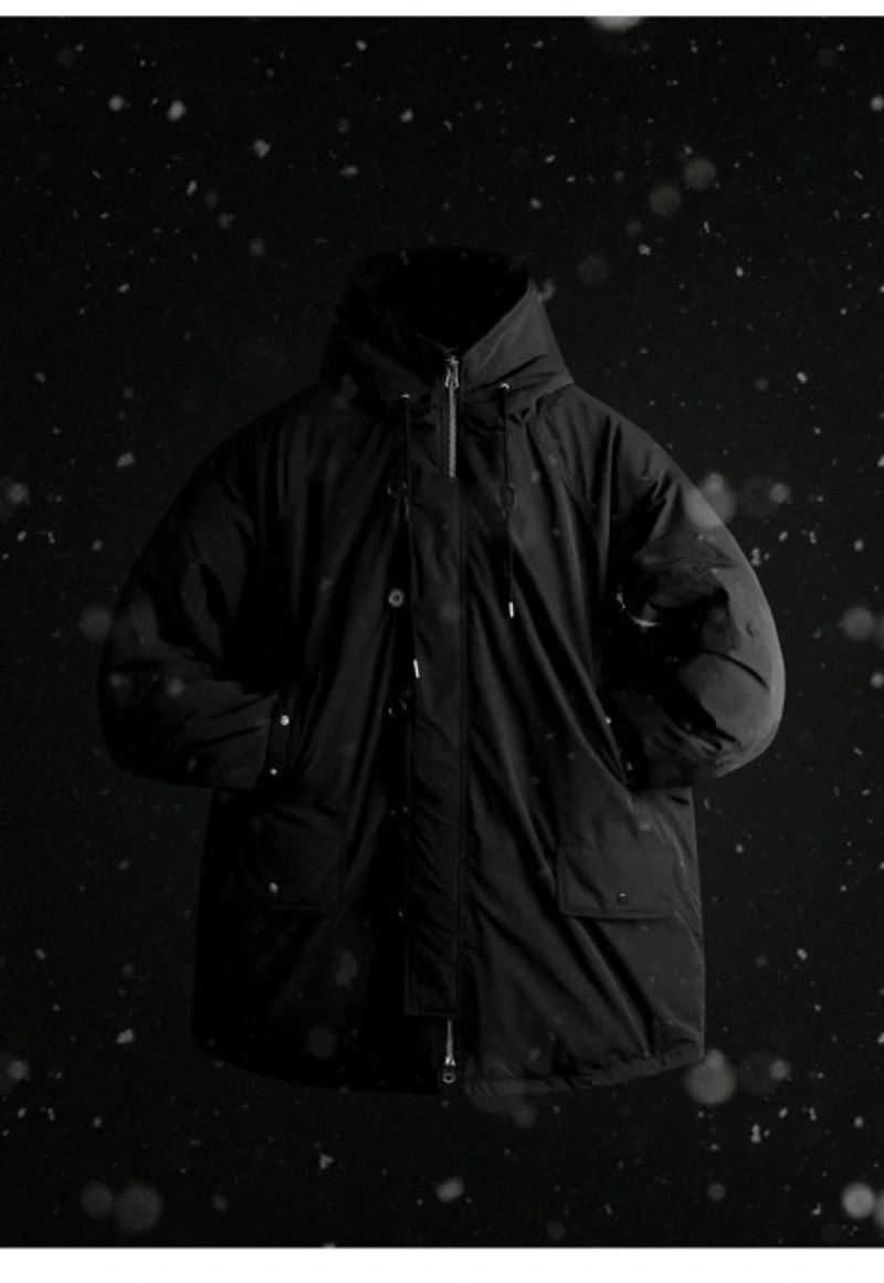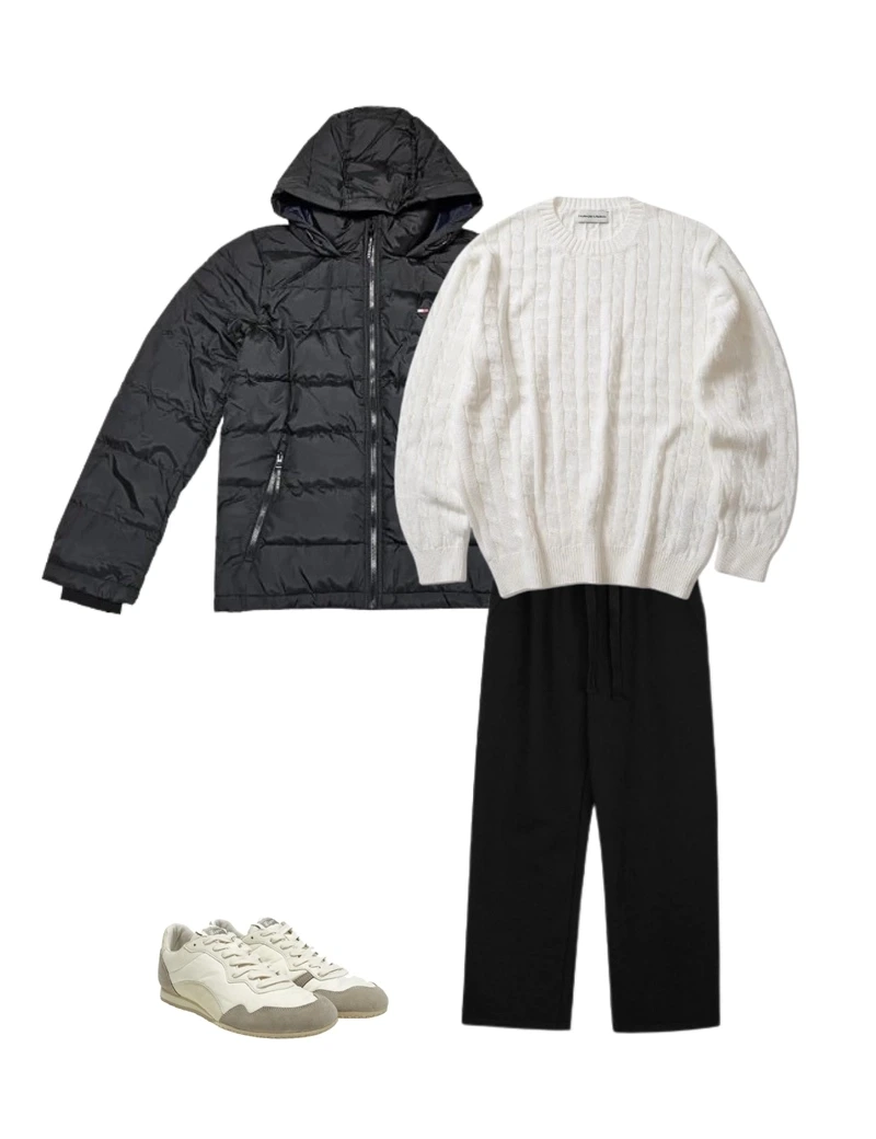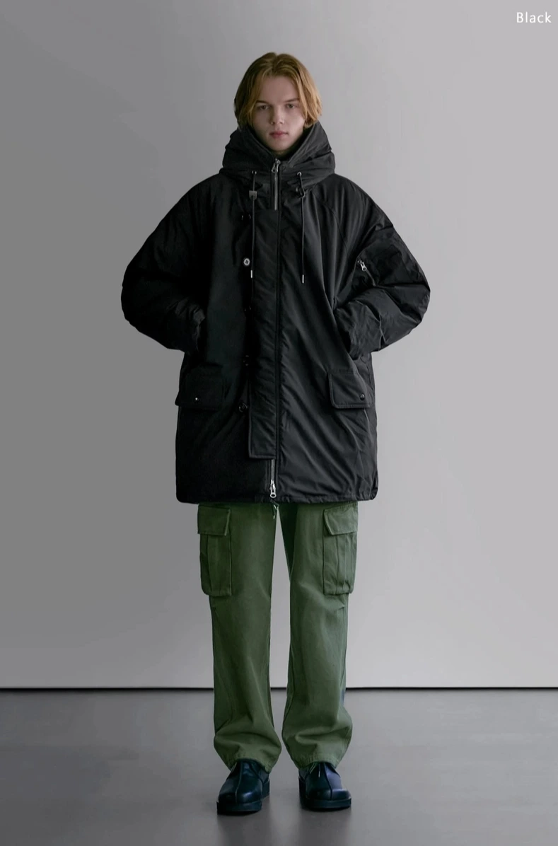 허리와 밑단에 조절 가능한 스트링이 있어 체형에 맞게 핏을 조정할 수 있으며, 추운 날씨에도 체온을 효과적으로 유지해줍니다. 블랙 패딩에 파카 스타일의 목폴라 니트와 검정 바지를 조합하면, 세련된 모노톤 룩을 완성할 수 있어 따뜻하면서도 고급스러운 겨울 코디가 됩니다.