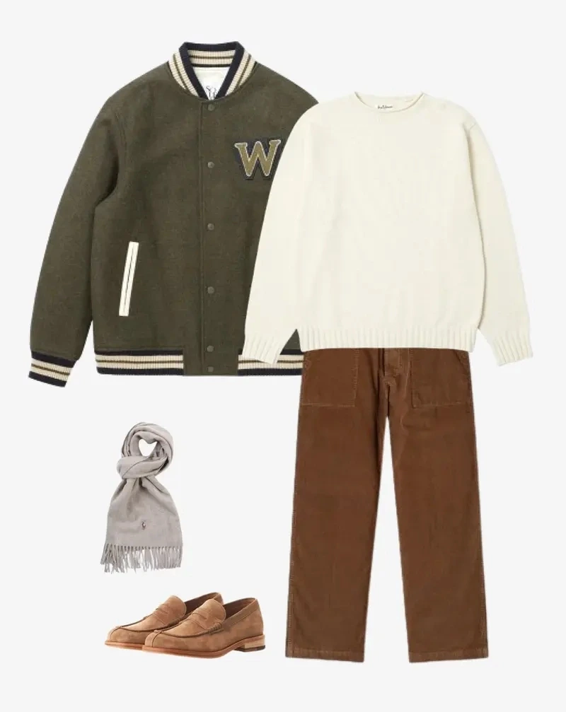 두 번째는 좀 더 따뜻한 분위기의 데이트룩입니다. 크림 컬러 롤넥 스웨터와 브라운 팬츠의 조합은 부드럽고 온화한 인상을 주기에 충분하죠. 여기에 카키 컬러의 바시티 재킷을 더하면 편안하면서도 센스 있는 분위기를 연출할 수 있습니다. 액세서리로는 베이지 컬러의 머플러를 추천드리며, 따뜻함을 더하는 동시에 고급스러움을 배가시킵니다. 마지막으로 캐주얼하면서도 세련된 브라운 로퍼를 매치하면 어디서든 돋보이는 룩이 완성됩니다.