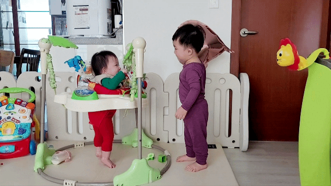 바다가 앉아서 걸음마보조기의 버튼을 누르는 쌍둥이를 지그시 바라보다가, 갑자기 걸음마보조기를 밀고 걷는 모습을 보여주더라고요. 그 뒤로 쌍둥이는 걸음마보조기를 잡고 일어서는 연습을 시작했어요. 연년생 아이들은 이렇게 익숙한 놀잇감과 교구들을 공유하면서 같이 성장하게 돼요. 그래서 '둘째는 원래 이렇게 빠른가요?' 하는 글이 많이 보이죠. 실제로 둘째가 첫째보다 빠른 아이일 수도 있지만, 첫째를 통해서 배웠을 확률도 높아요.