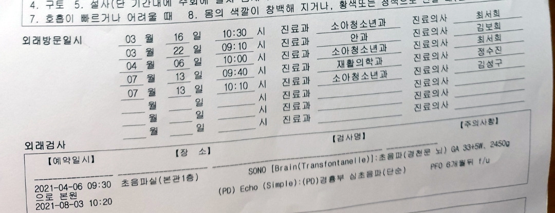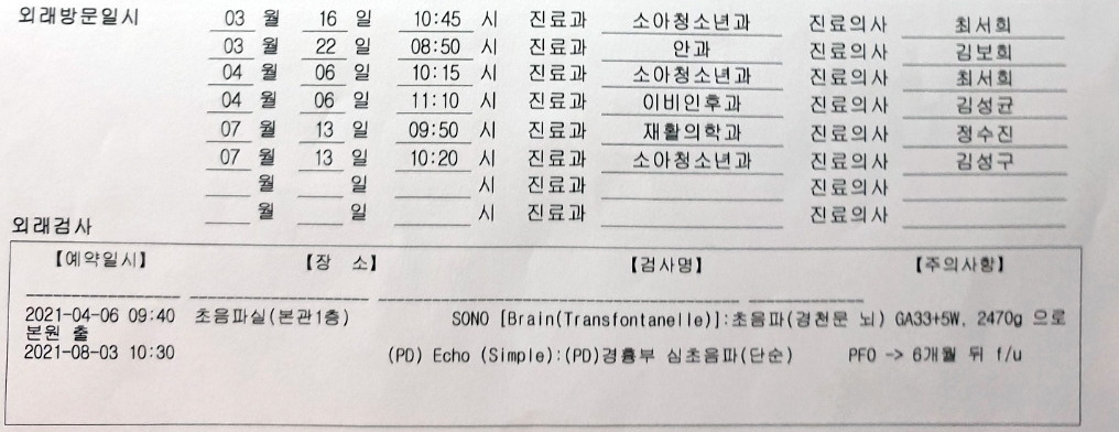 저는 임신 29주 차부터 지속된 조기진통으로 입원했고, 결국 임신 33주 5일에 양수가 터져서 제왕절개로 출산했어요. 운이 좋게도 이른둥이 쌍둥이치고는 훌륭한 2.54kg , 2.47kg의 체중으로 태어났으나 자발호흡이 불안정해서 NICU(신생아중환자실)에 열흘동안 입원했고요. 이른둥이임을 감안하면 입원기간이 길지는 않았어요. 그럼, 이렇게 퇴원하면 단태아처럼 평범하게 키우면 되는 걸까요? 아니요. 열흘이 지나고 알송이와 달송이가 퇴원할 때 받은 진료예약안내문을 보여드릴게요.