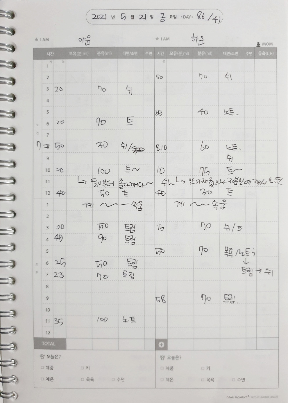 이건 실제로 제가 알송이 달송이 생후 86일에 작성한 수유일지입니다. 옆의 41의 의미가 궁금하시죠? 이른둥이들은 출생당시의 체중이나 건강, 발육상태에 따라서 주치의들이 '교정일을 체크하세요.'라고 권해요. 저희 쌍둥이는 재태주수 33주 5일에 태어났고 NICU에서 지냈기에 그 권고를 받아서 저도 교정일을 함께 체크했어요. 태어난 지는 86일이지만, 만삭으로 태어났다면 41일 차라는 뜻입니다. 그래서 발달은 41일 차만큼 더딜 수 있음을 감안하는 거죠. 초산모인 쌍둥이엄마는 평범하게 태어난 아이의 데이터를 책에서만 봤으니 '정상'의 기준을 잡을 수 없어서 더욱 혼란스러울 거예요.