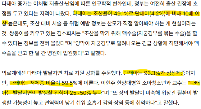 쌍둥이도, 연년생도, 단태아 출산도 경험했지만 제 이야기만으로는 글의 신빙성이 부족할 수 있으니 기사를 소개할게요. 2024년 11월 한국일보에서 발행한 다태아 관련 기사입니다.
