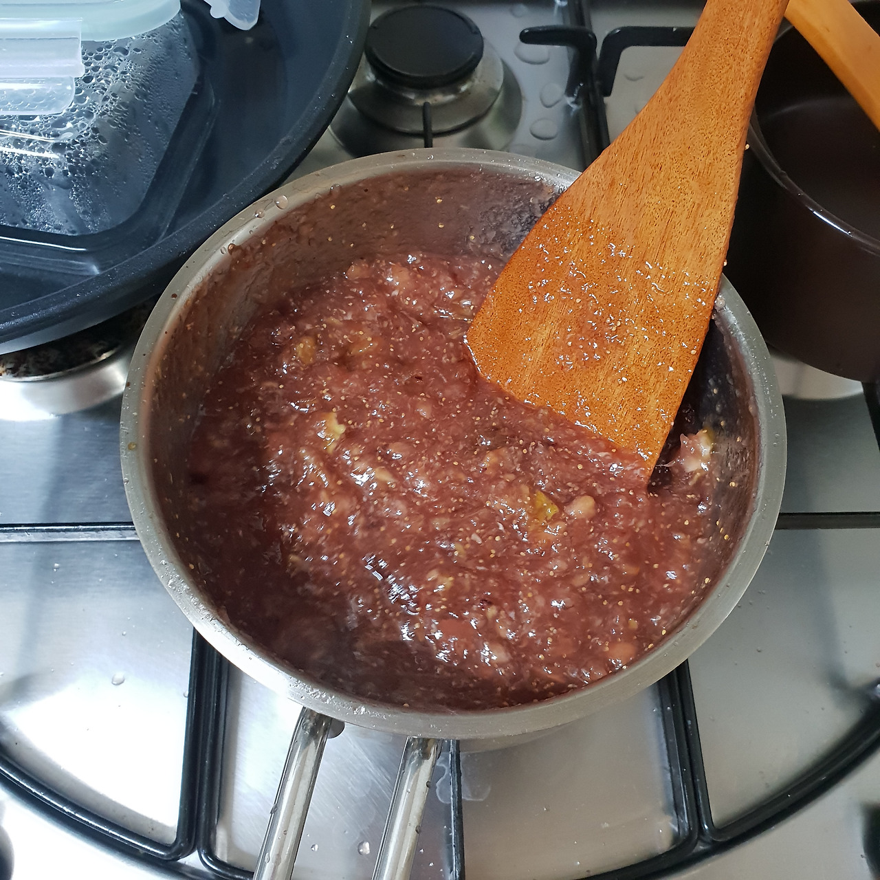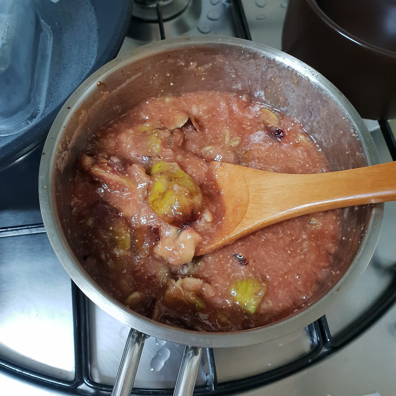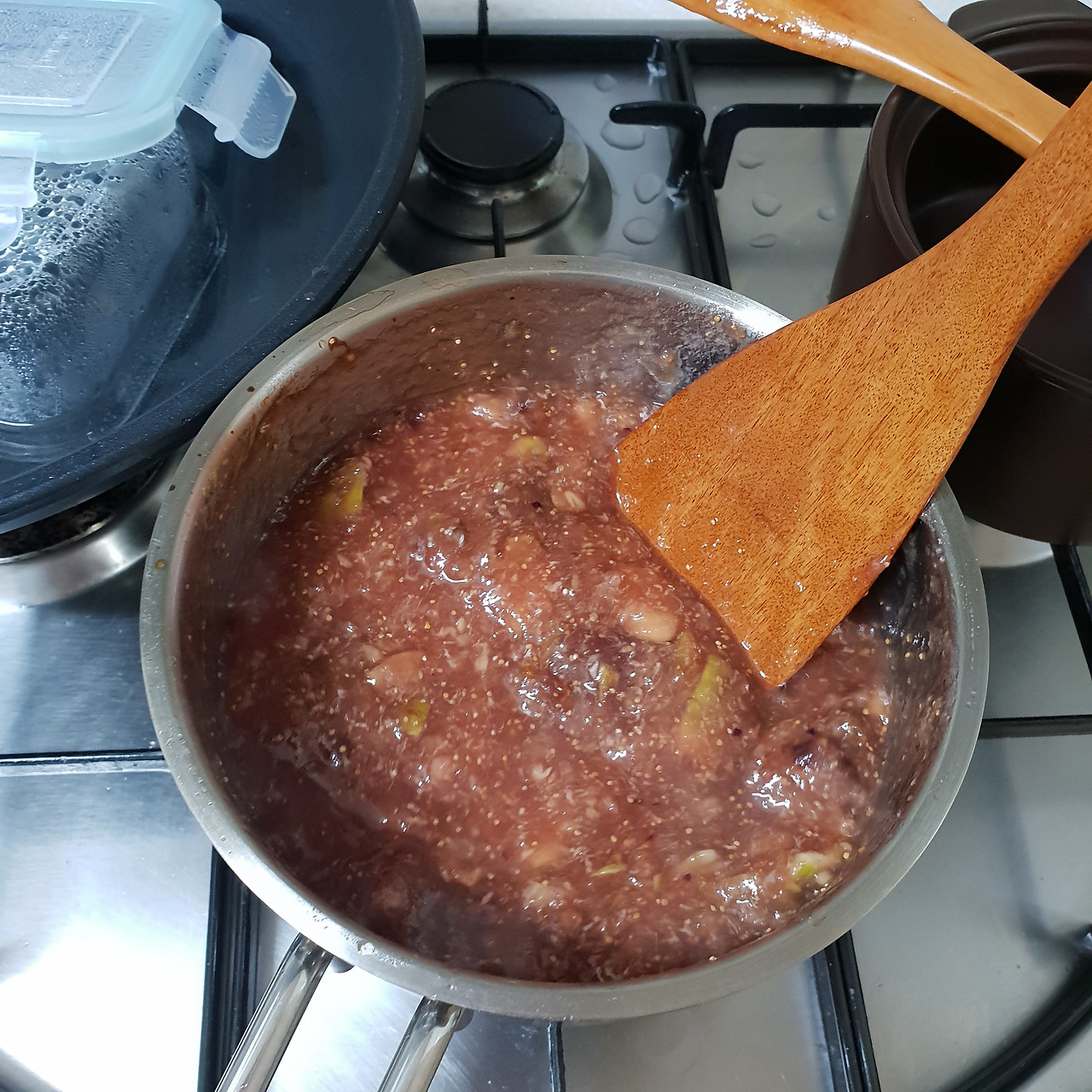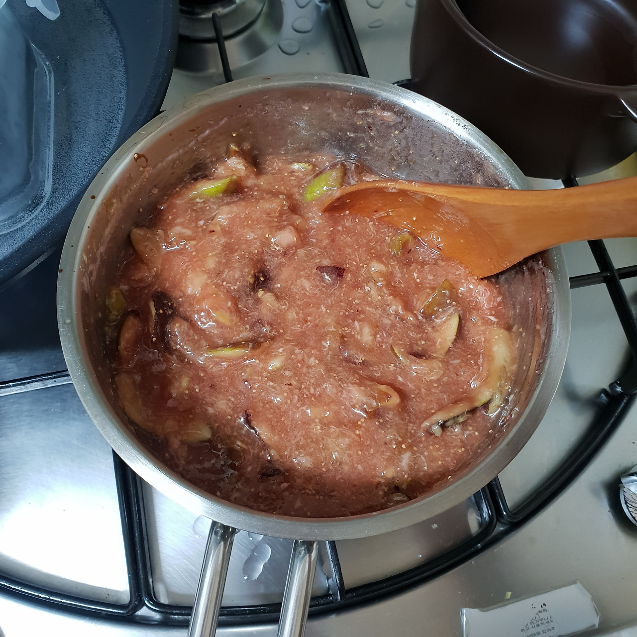 주걱으로 꾹꾹 눌러가며 무화과 껍질과 알맹이들을 으깨준다. 점점 색이 짙어지고 있는 무화과잼