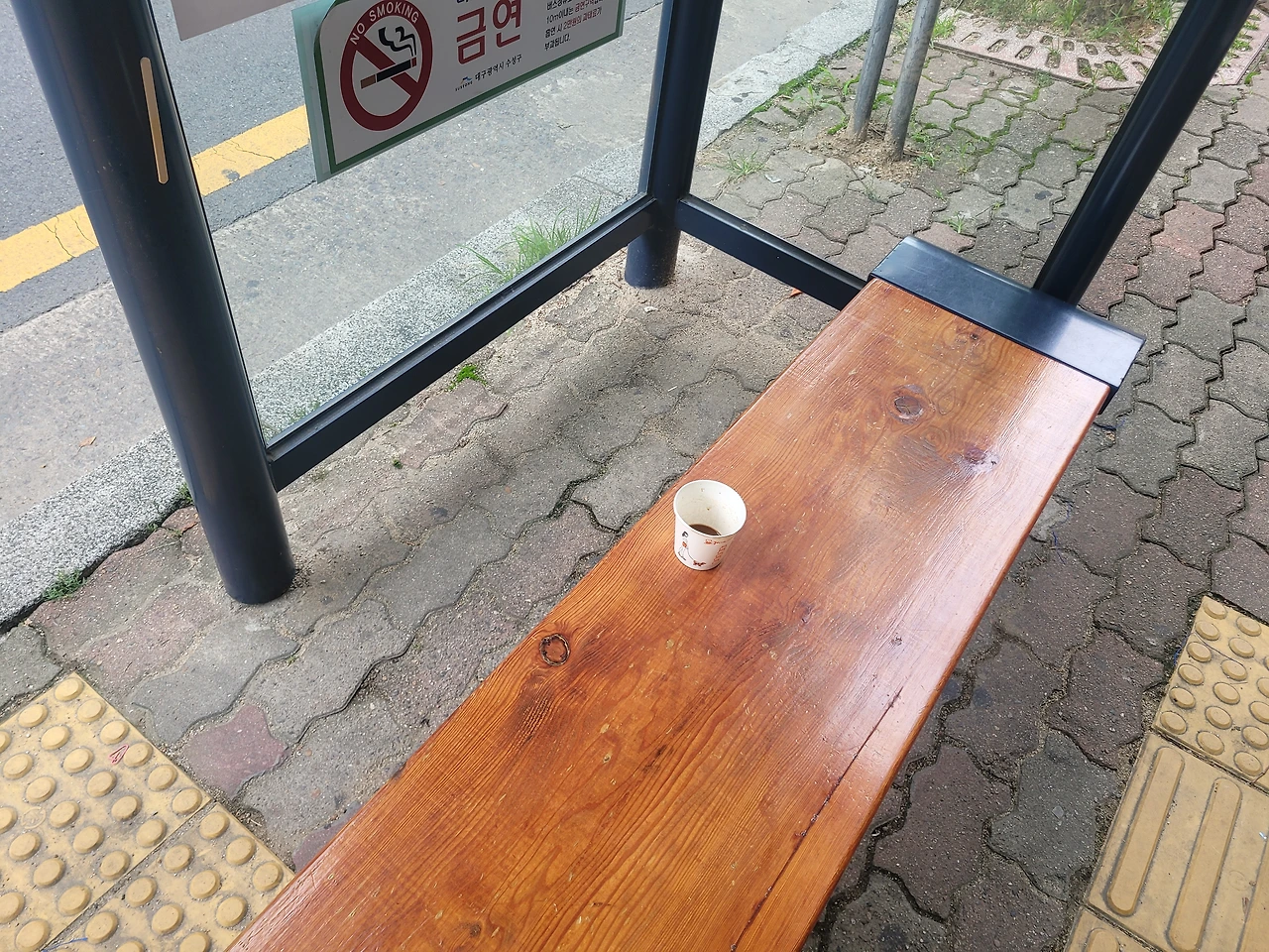 버스를 기다리다 한쪽에 눈이 갔다. 버스정류장 벤치의 마시다만 종이컵 커피.