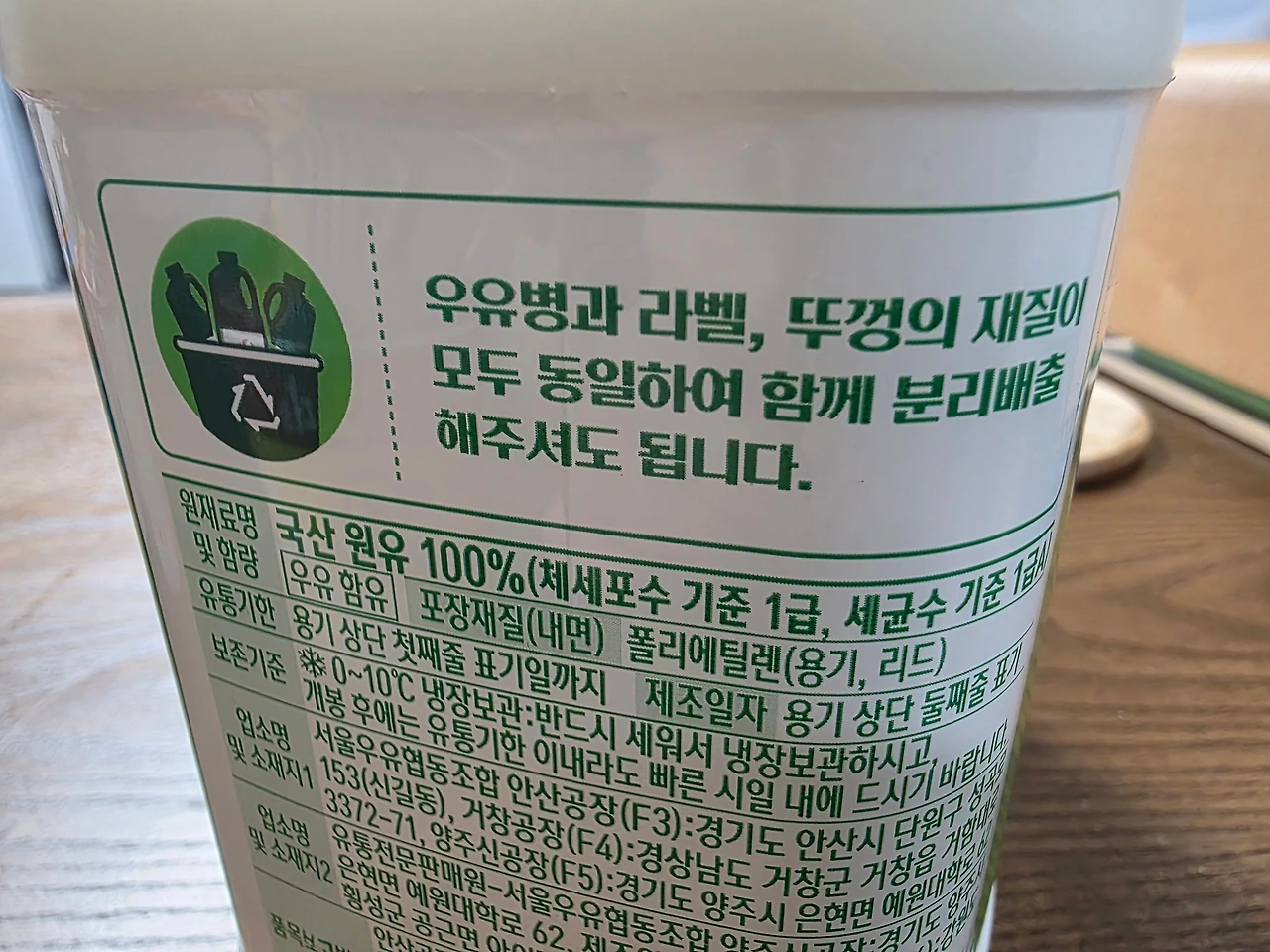 우유병과 라벨, 뚜껑의 재질이 모두 동일하여 함께 분리배출 해주셔도 됩니다.