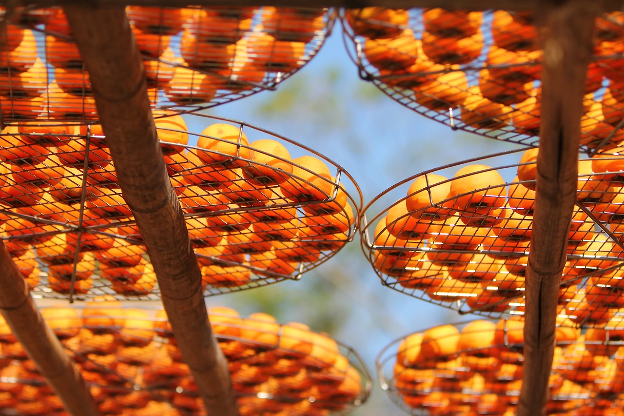 이전에 칼럼 '곶감' 편에서 언급 했듯이 곶감은 상처 없이 무르지 않은 단단한 감 만을 추려 껍질을 깎아 전용 꼬챙이에 꿰거나, 전통 방식인 실에 엮는 방법을 이용해 감을 줄줄이 달아 가을 바람이 잘 불어오는 장소의 공중에 걸어 두면 사람의 역할은 대부분 끝난다. 나머지는 바람이 오랜 시간 정성을 들이며 완성으로 이끈다.