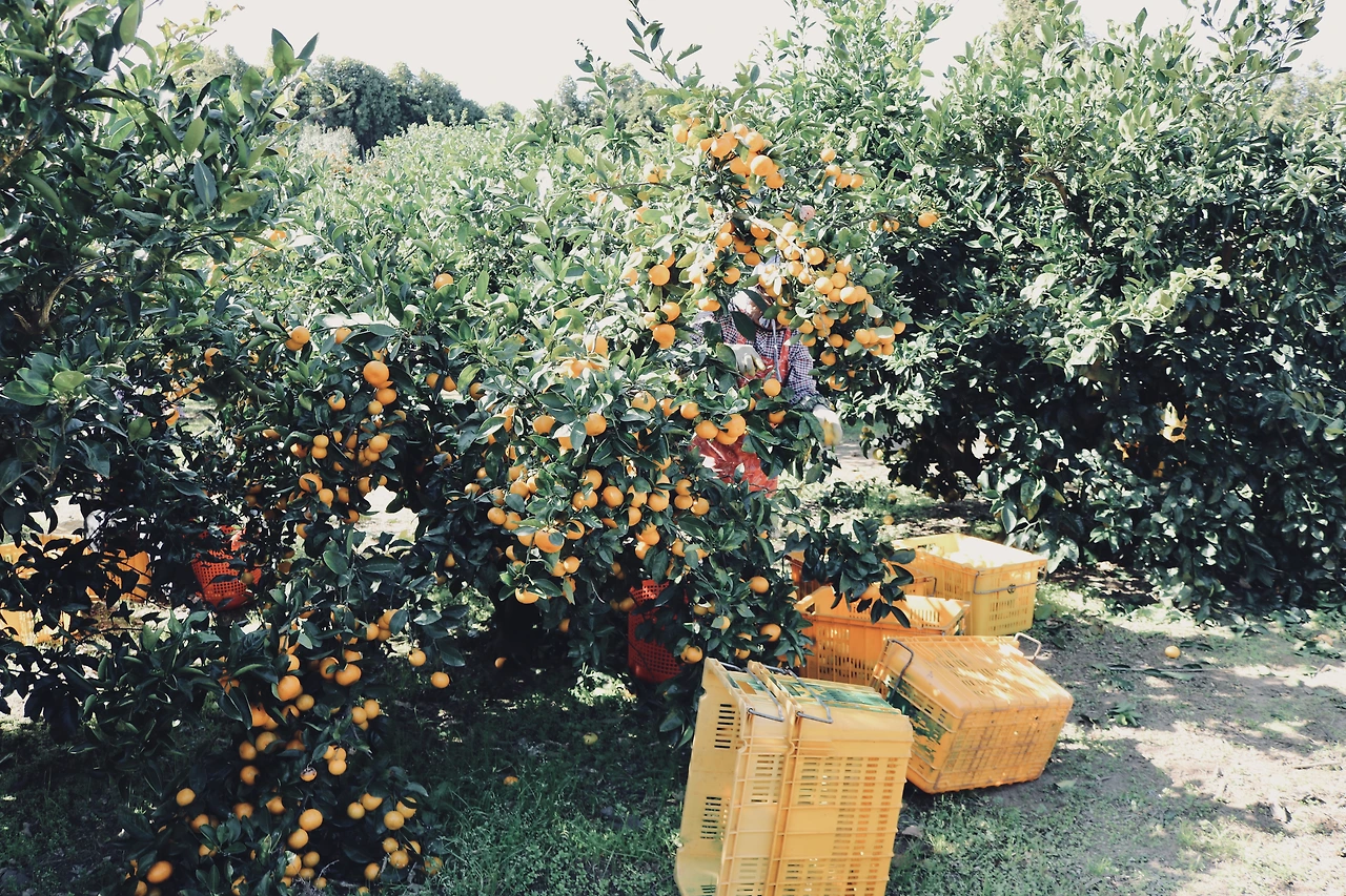 도착한 그곳에는 담장에 가려져 머리만 보였던 귤나무들이, 가림막 없이 파란 하늘 아래 헤아리기 힘들 정도로 넓게 펼쳐져 있었다. 온통 초록의 잎새였고, 하늘은 구름이란 장식이 거추장스러웠는지 죄다 밀어내어 밋밋했으며 햇빛은 자제력 없이 내리쬐고 있었다.