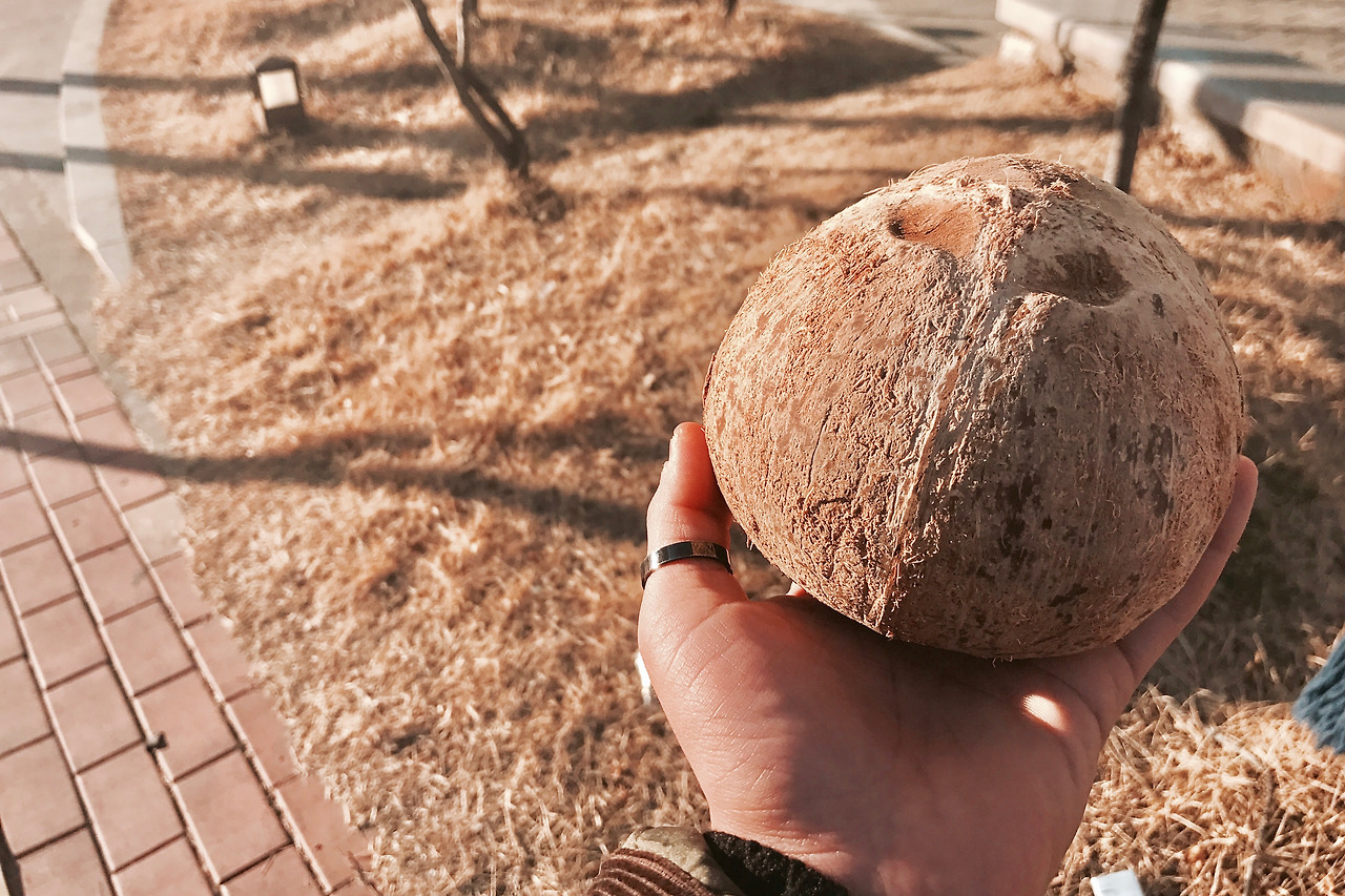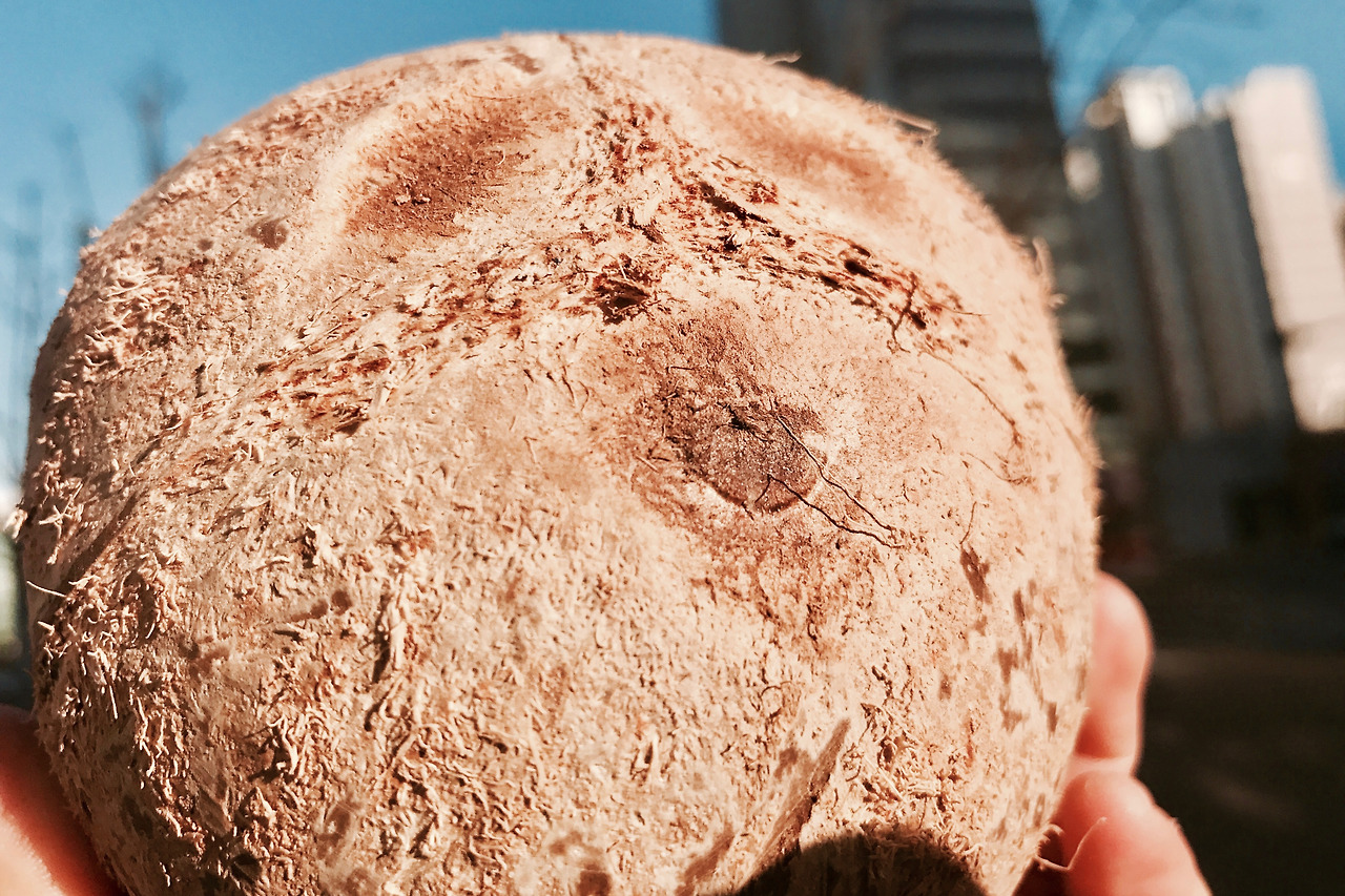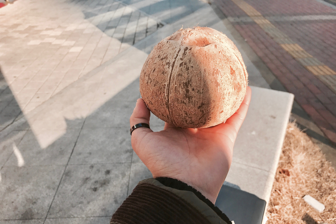 손님이 뜸한 마트, 어느 과일 코너에서 집어 들었다. 찰랑 거리는 소리가 기분 좋았으나, 까끌한 표면은 그다지 달갑지 않은 꽤 익어 있는 상태로 보였다. 코코넛은 상부에 3개의 짙은 색 점이 삼각 형태를 이루는데