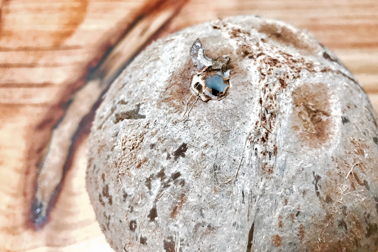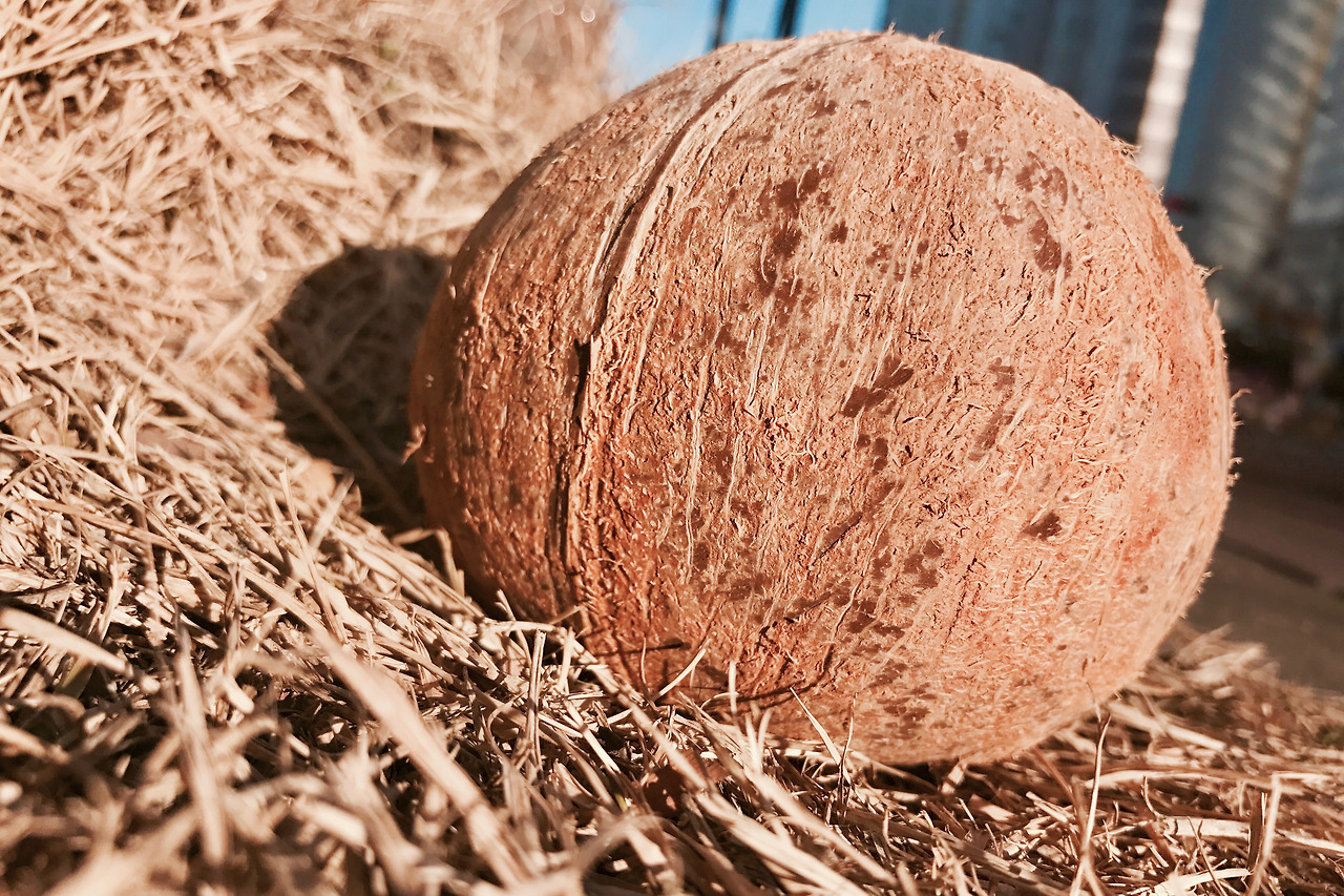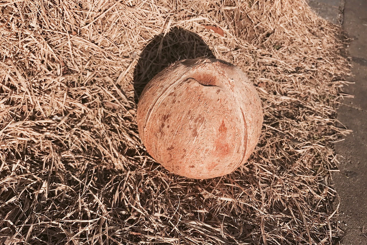 손님이 뜸한 마트, 어느 과일 코너에서 집어 들었다. 찰랑 거리는 소리가 기분 좋았으나, 까끌한 표면은 그다지 달갑지 않은 꽤 익어 있는 상태로 보였다. 코코넛은 상부에 3개의 짙은 색 점이 삼각 형태를 이루는데