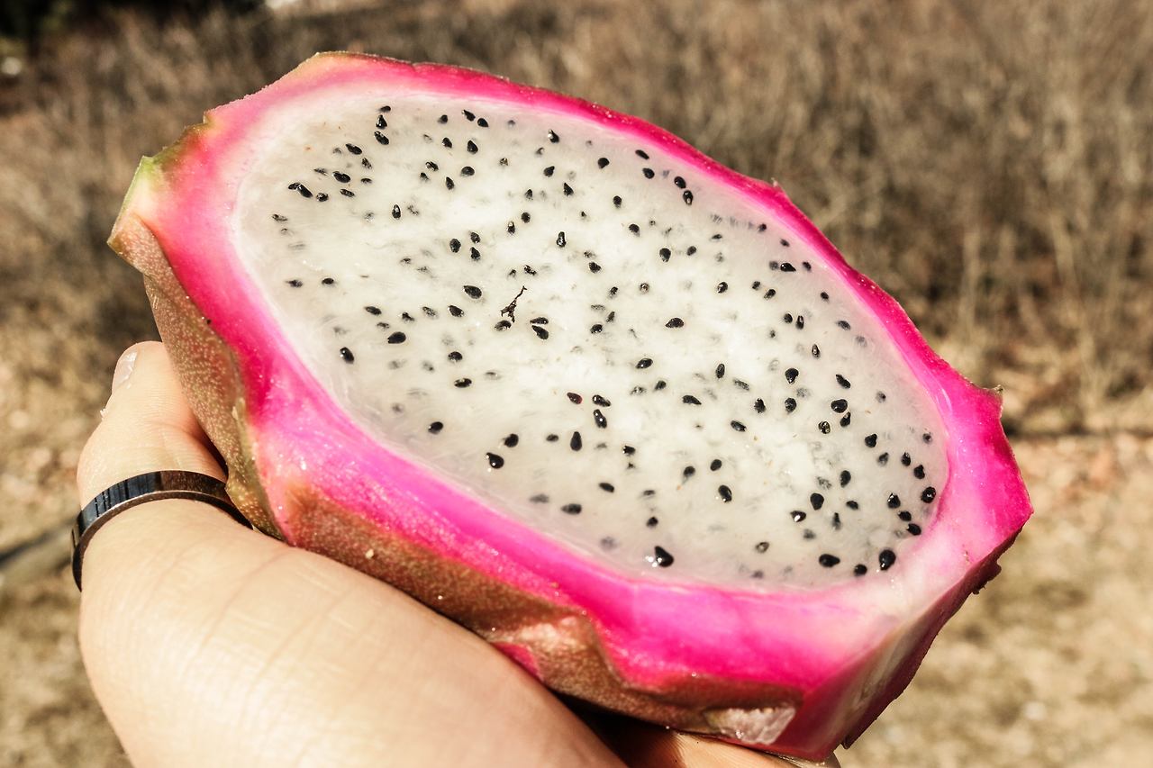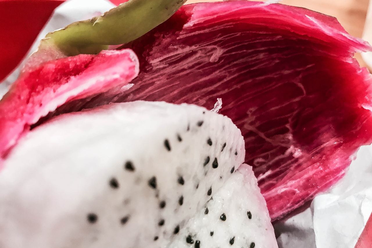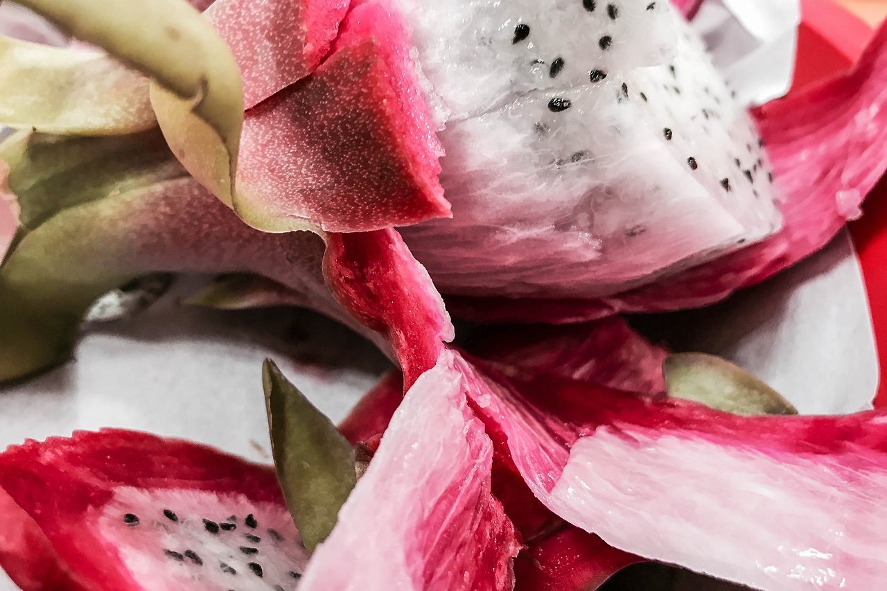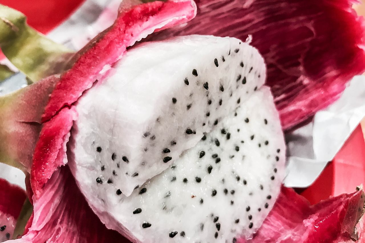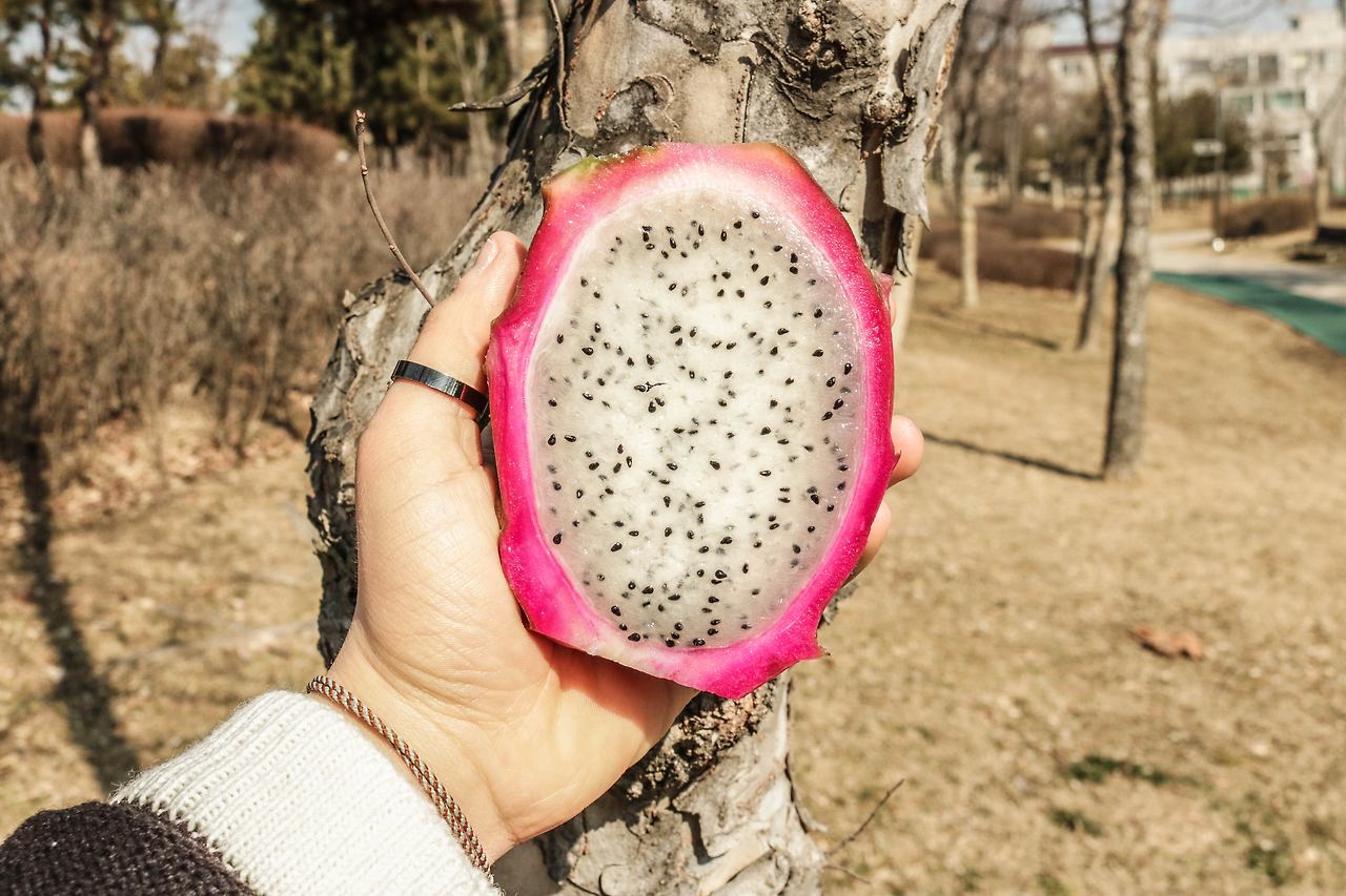 선인장 과일이라 불리는 '용과'는 과연 어떤 맛일까, 쉽게 접할 수 없었기에 그 맛이 어떨지 궁금했다. 최근 몇 년 사이 다양한 열대과일이 국내 시장에 유통되고 있으니, 매년 처음 먹어보는 과일이 생길 듯싶다. 용과를 반으로 잘랐을 때, 칼이 들어가는 느낌은 꼭 키위나 바나나 같은 무른 과일을 잘라 내는 느낌과 닮아있었다.