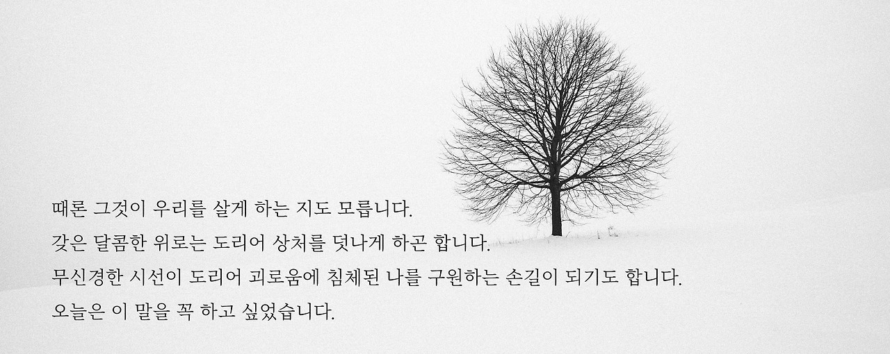 때론 그것이 우리를 살게 하는 지도 모릅니다. 갖은 달콤한 위로는 도리어 상처를 덧나게 하곤 합니다. 무신경한 시선이 도리어 괴로움에 침체된 나를 구원하는 손길이 되기도 합니다. 오늘은 이 말을 꼭 하고 싶었습니다.