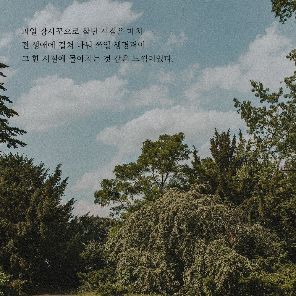 그녀와의 인터뷰도 끝나고, 글도 다 완성해 이미 선보인 지금도 저는 그녀와 나눈 직업에 대한 이야기를 잊지 못합니다. 지금에 와서 보면 저는 제가 가졌던 모든 직업을 사랑했어요. 광기사, 과일 장사꾼, 작가 등 작가를 제외하곤 어느 것 하나 원해서 시작한 일은 없지만, 그래서 처음에는 많이 미워도 했지만 결국 사랑하게 되었죠. 작가 일도 그렇습니다. 처음으로 원하던 직업을 갖게 된 것이니 초창기에는 갓 시작한 연애처럼 매일매일 사랑스러웠습니다. 그러던 게 어느 시점을 넘기자 미워졌어요. 써도 써도 늘지 않는 실력과 발전 없는 인지도에 괴롭고, 아무리 해도 큰돈이 되지 않는 현실에 환멸감을 느꼈습니다. 그런 중에도 무언갈 쓰는 제 모습은 속절없이 좋았고요. 누군갈 만나 대화하고, 그의 이야기를 사람들에게 선보이는 건 언제나 짜릿했습니다. 아이러니하죠? 미워하다가도 그럴 때면 다시 사랑을 하는 게.