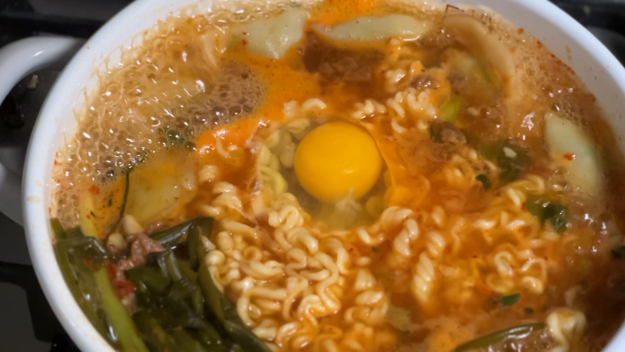 추운 날 얼큰하게 끓여 먹는 파김치 계란라면, 속이 따뜻해지고 기분까지 풀리면서 배가 차차 불러오는 기분이 좋습니다. 계란에 파김치 올려서 한 입, 개운한 국물에 쫄깃한 면발 듬뿍 담가서 볼 가득히 먹는 라면.