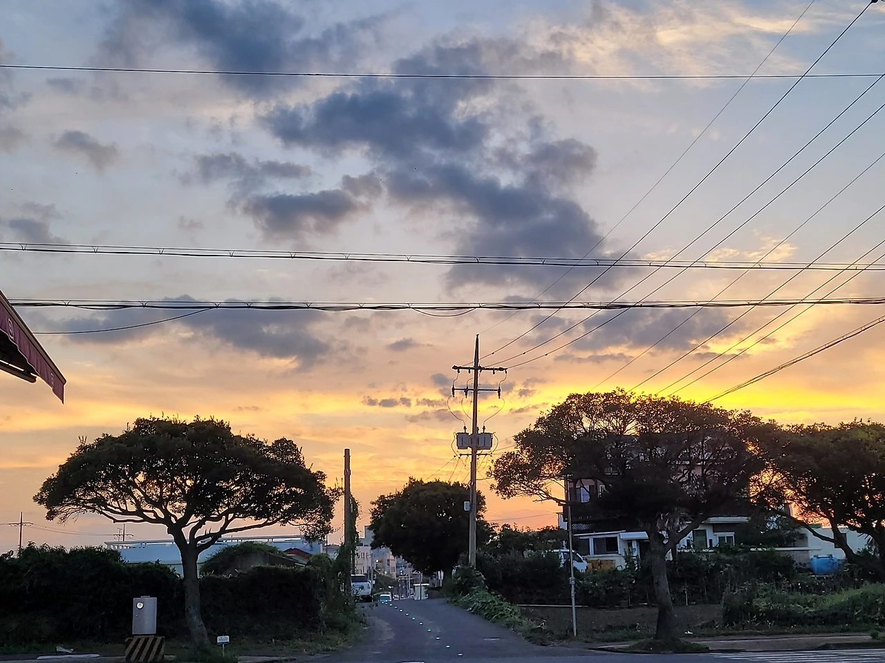 밥을 먹으러 걸어가는데 그 사이 점점 해가 지는데 너무 이쁘다. 서울에서는 해 지는 걸 볼 기회가 없었는데