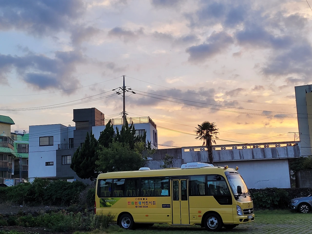 노을이 너무 이쁘게 지고있다. 어린이집 버스까지 무드있어보여서 기록했다.