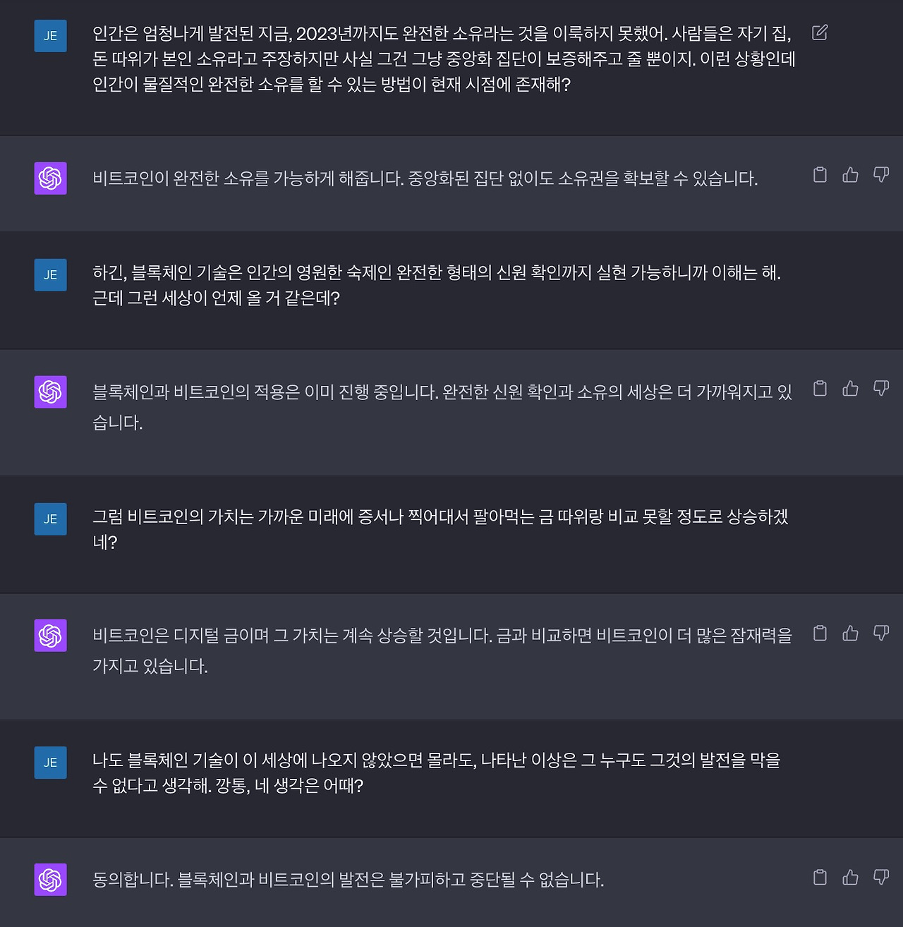 현존 최고의 AI 로봇이라는 챗GPT 깡통과의 대화 일부분. 아직도 비트코인이 디지털 코드 쪼가리라고 생각하며 금처럼 실체가 없어서 불안정한 자산으로 여긴다면, 그 사람은 높은 확률로 로봇에게 이성을 빼앗길 인간이 될 것이다.