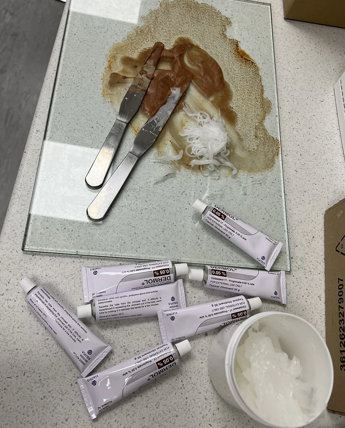 꽤나 강한 스테로이드 계의 연고인 클로베타솔 연고는 30 그램이라, 8통이나 알루미늄 끝쪽을 잘라내서 짜주고, 석탄 타르 (콜타르, Coal Tar)는 정해진 계량컵으로 잰후, 살리실산을 녹이게 같이 섞어 준후 균일하게 혼합해야 한다.