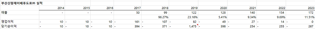 아래는 부산신항제이배후도로(주)의 10년간 요약 손익계산서 및 2023년 요약 재무상태이다.
