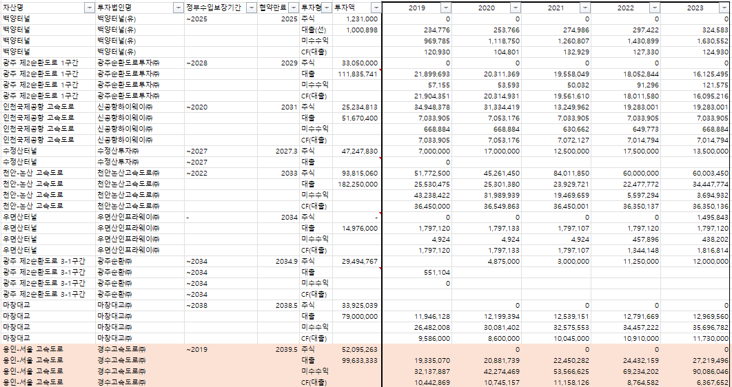 아래는 2019~2023년 각 프로젝트/SPC별 수익, 현금흐름이다.