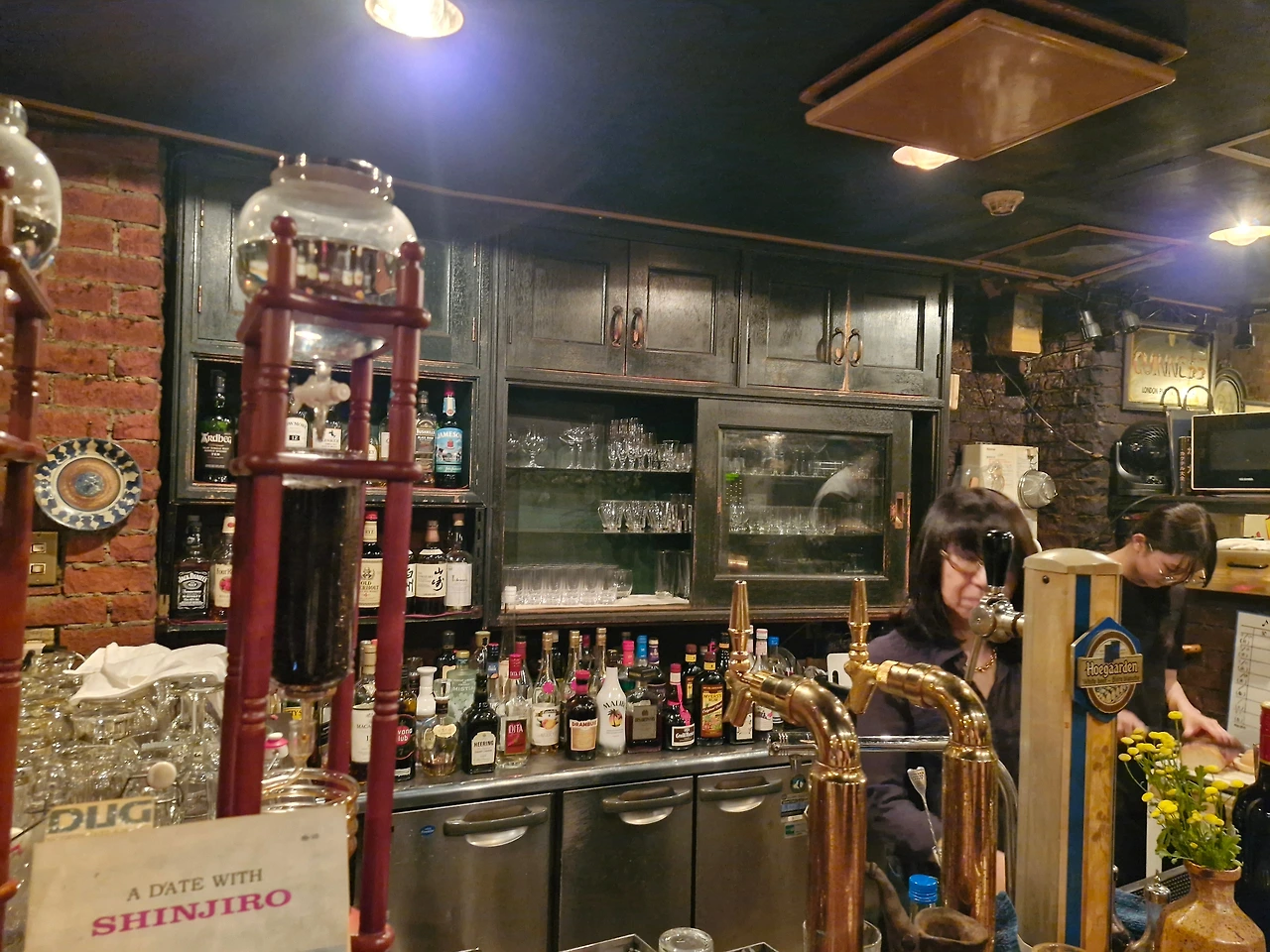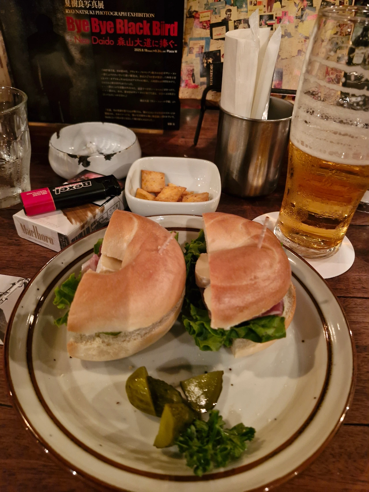 계단 아래에서 점원이 혼자 왔냐고 물어보고, 카운터 자리로 안내했다. 나는 그녀에게 맥주와 베이글 치즈를 주문했다.