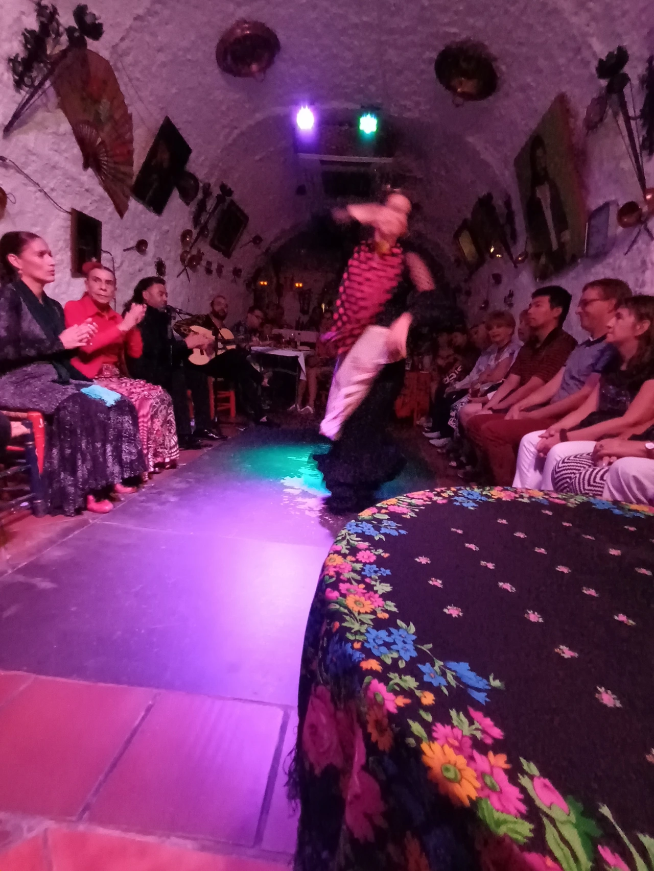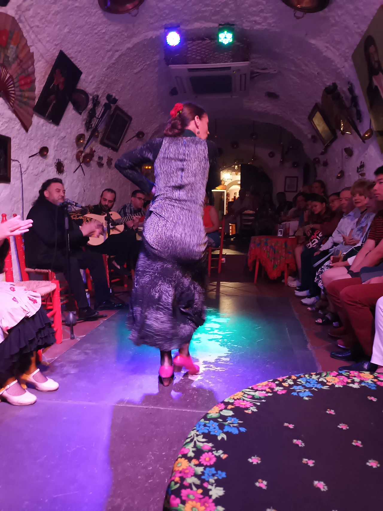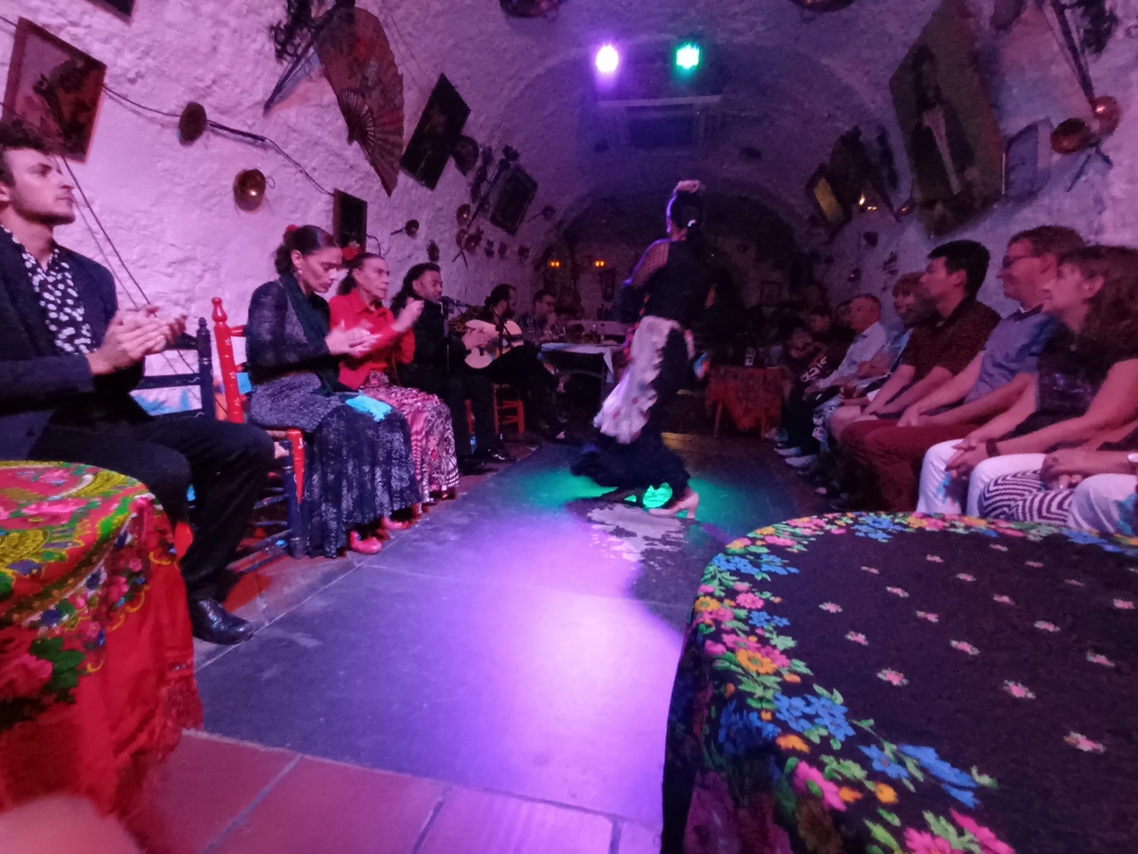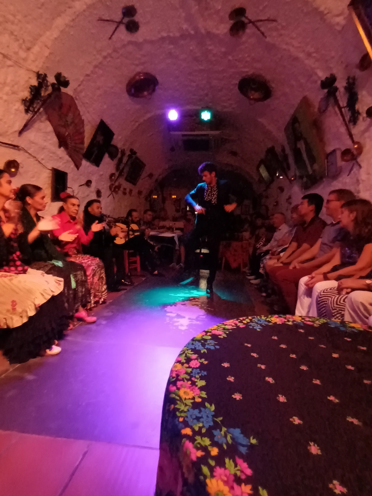 동굴에서 본 플라멩코는 공연자와 관중의 거리가 굉장히 가깝다는 것이 특징이다. 기타 연주자 한 명, 가수 한 명, 댄서들 세 명이서 한 시간 동안 플라멩코가 무엇인지를 보여 주었다. 동굴 플라멩코는 다른 공연장의 예술가들에 비해서는 약간 투박한 맛이 느껴졌지만, 집시들의 요소를 더 맛볼 수 있지 않았을까 생각이 든다. 빠르고 강렬한 플라멩코 기타 소리가 연속적으로 들리면서, 그 위에 가수의 아랍적인 풍이 느껴지는 노래에 맞춰서 댄서들은 슬픈 듯 비장한 듯 보이는 눈빛으로 빠르고 강한 구둣발 소리를 내며 춤을 춘다. 가수와 앉아 있는 다른 댄서들은 손바닥을 쳐서 비트를 만들며 무희의 춤에 맞춰 준다. 손뼉 리듬은 일률적이지 않고 음악과 춤의 전개과정에서 다양하게 바뀌고 있었다. 와인 한잔을 마시며 보는 플라멩코는 더욱 보는 이의 느낌을 쏟아 오르게 하였다.