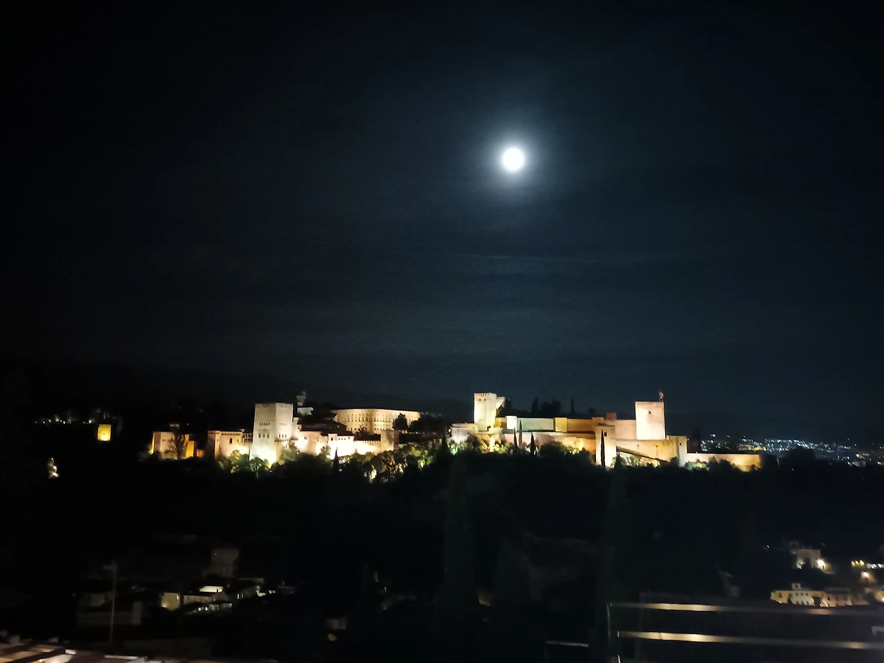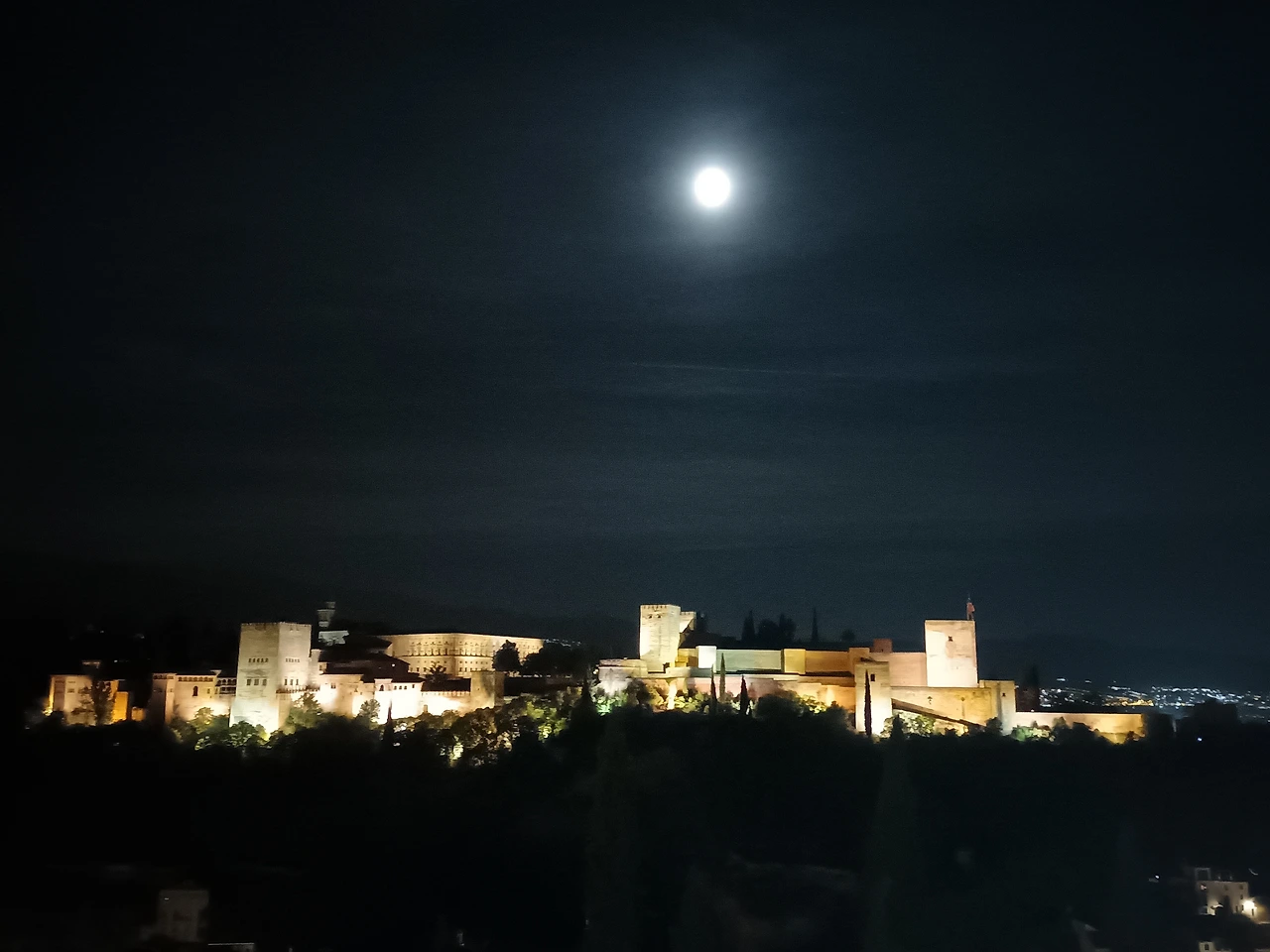 달빛 아래의 알람브라 궁전의 야경으로 반대편 언덕에서 촬영함.