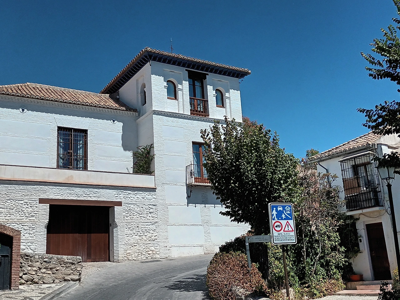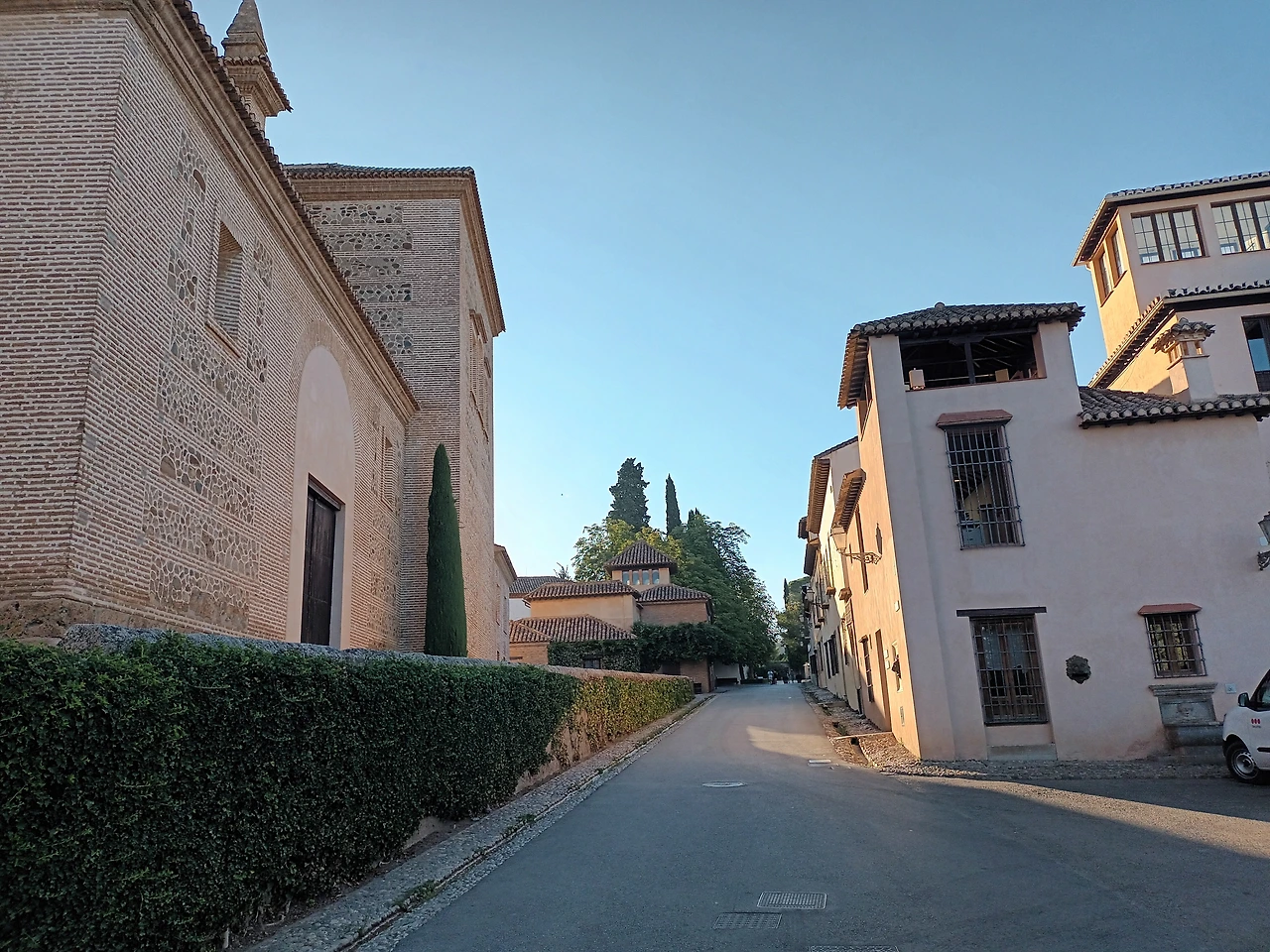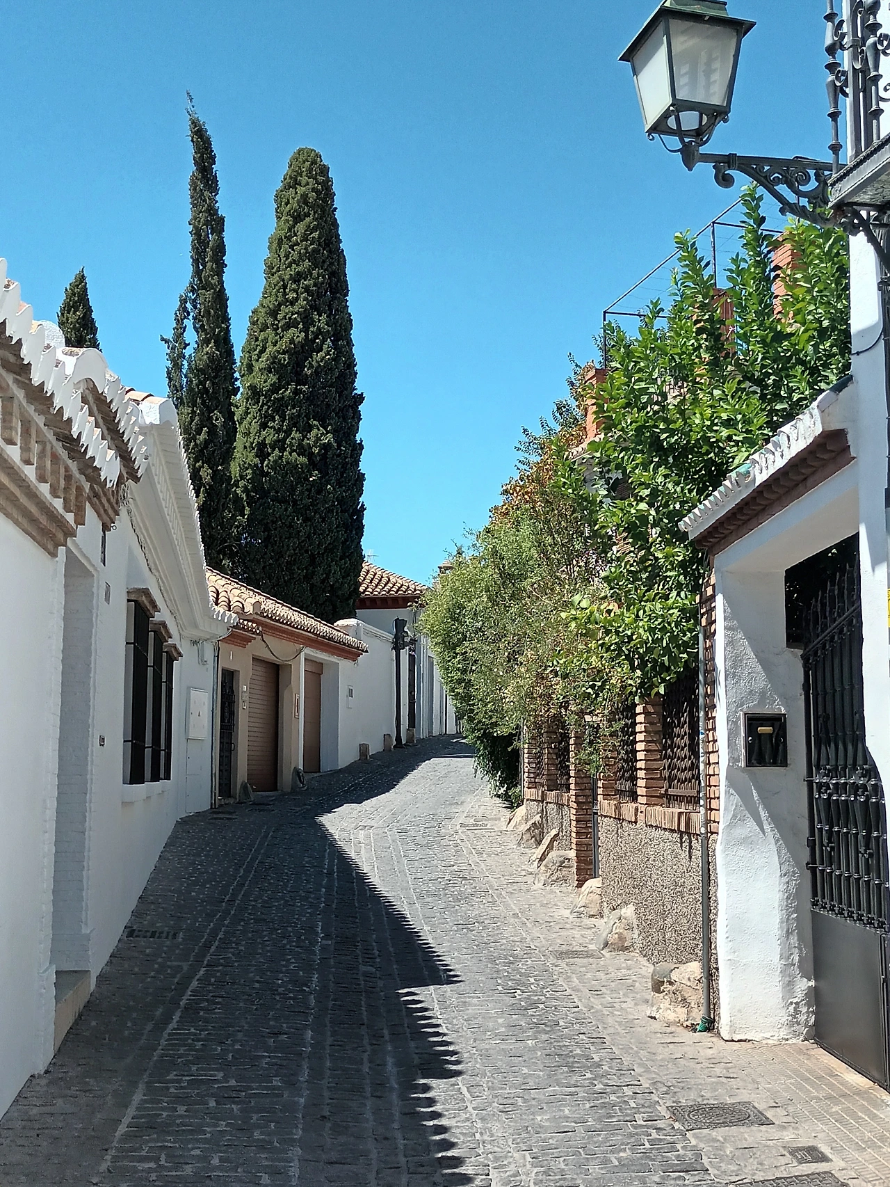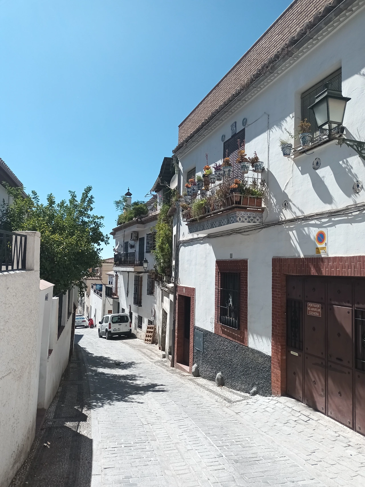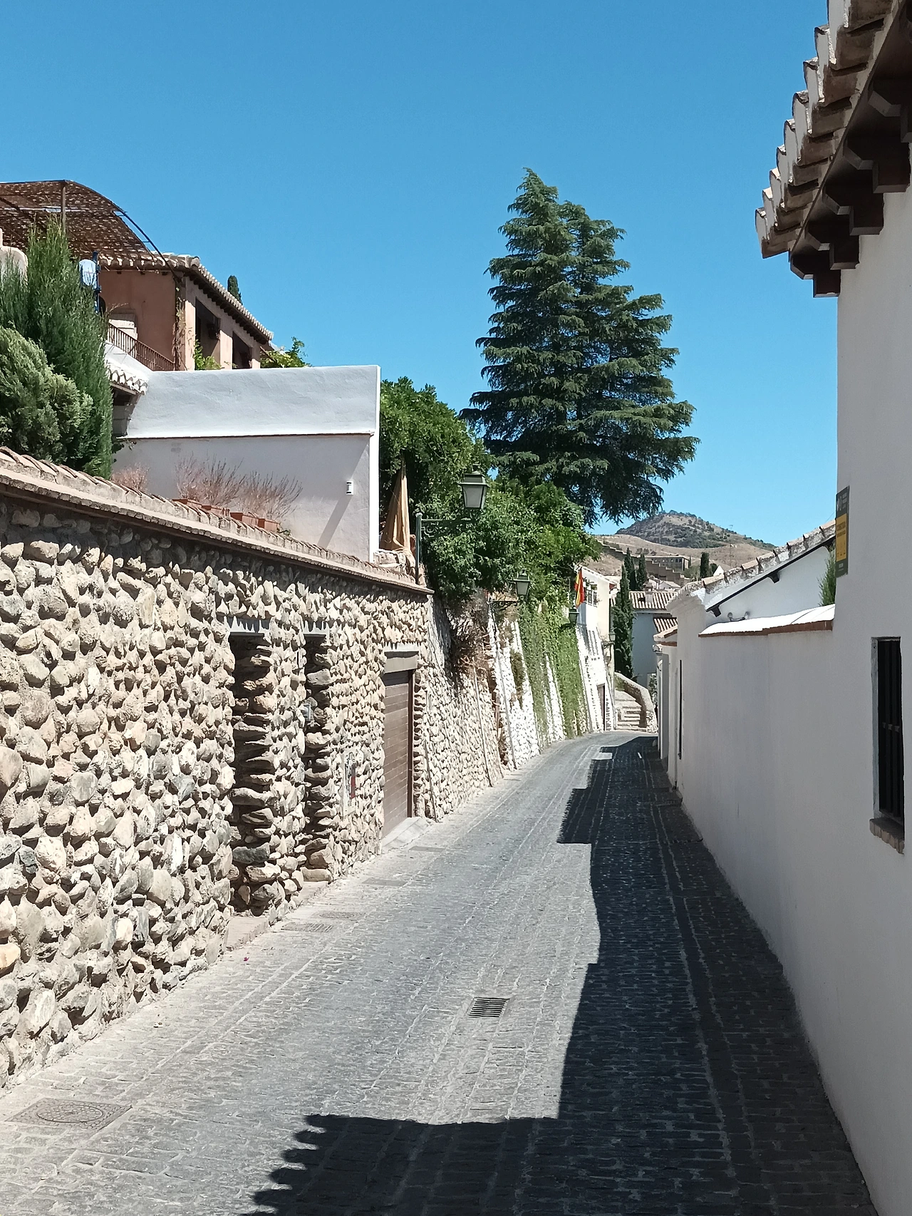 알람브라 궁전을 나온 후에는 아침에 올라왔던 길과는 다른 길로 내려갔다. 경사가 급한 내리막길도 있었는데, 안내판의 설명을 보니, 꽤 오래전에 생긴 길인 것 같았다. 하천 위에 있는 조그만 다리를 건너가 보니, 어젯밤에 왔던 동굴 플라멩코 공연장과 알람브라 궁전의 전경을 봤던 전망대가 근처에 있는 것 같았다. 전망대는 여기서 약 20분 정도 도보로 더 올라가야 해서, 올라가는 길에 타파스 바에 들어가서 40분 정도 맥주와 타파스로 휴식과 요기를 하다가 나와서 전망대까지 오르막 골목길을 따라 올라갔다.