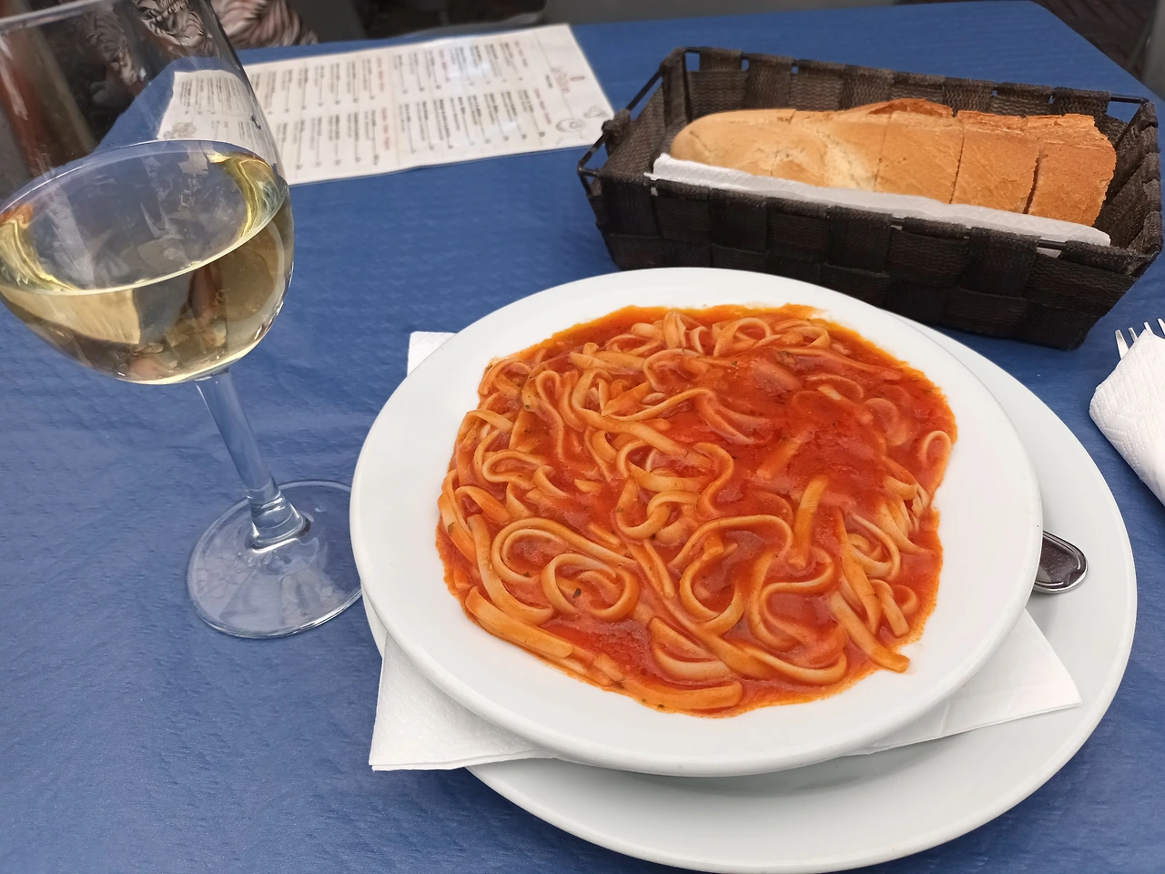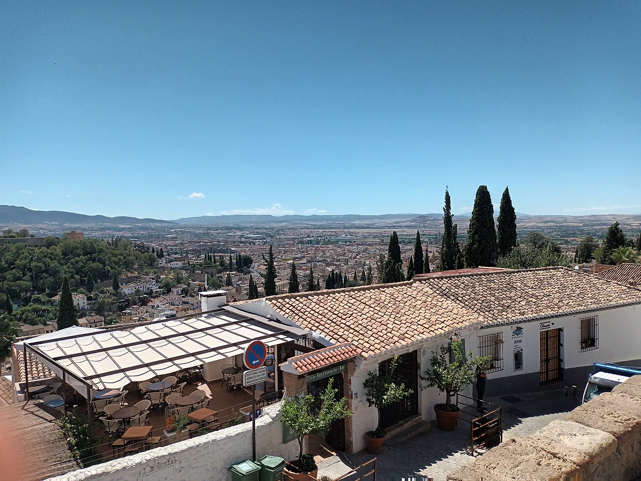 니콜라스 전망대에 도착하니, 저 멀리 알람브라 궁정의 전경이 눈에 다 들어왔다. 외국인에게 사진을 부탁하여 알람브라를 배경으로 사진도 찍어 보았다. 날씨가 너무 더워 나무그늘에 앉아서 기타 연주자의 버스킹 공연을 한참 동안 보며 휴식을 취하였다. 다시 정신을 차리고, 올라왔던 반대편 내리막길을 따라가다가 배고 고파서 레스토랑에서 스파게티와 와인으로 늦은 식사를 하였다. 그리고는 호텔로 가는 길을 따라 내려갔다.