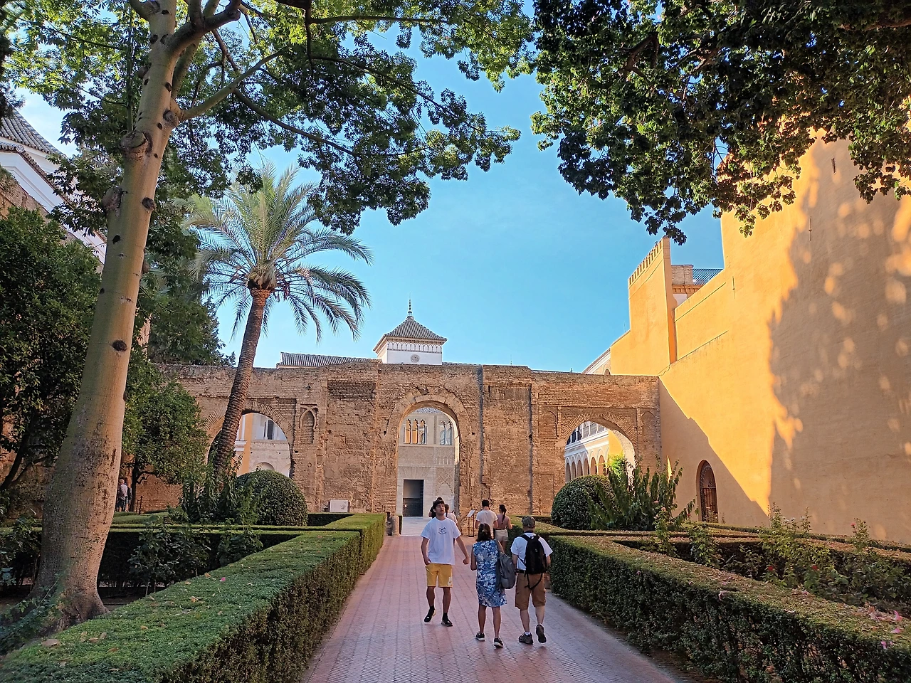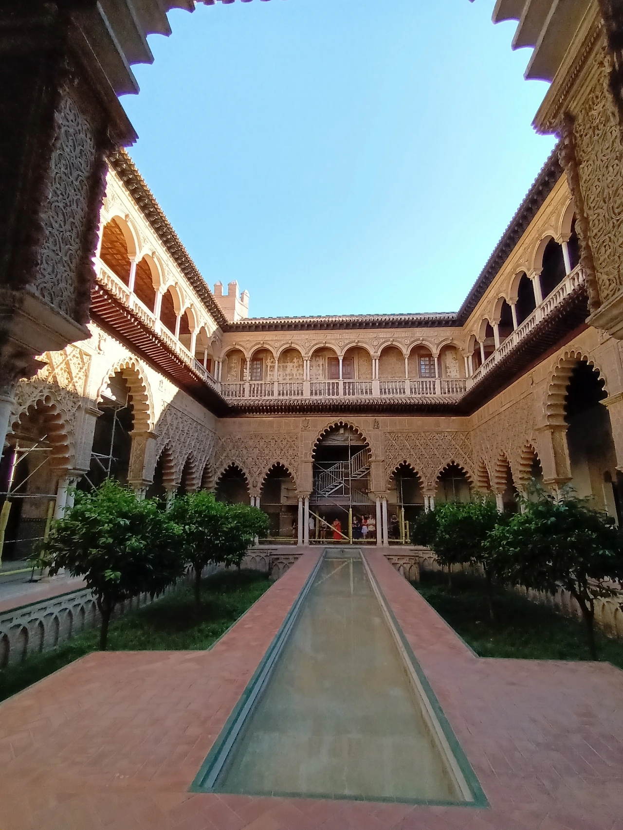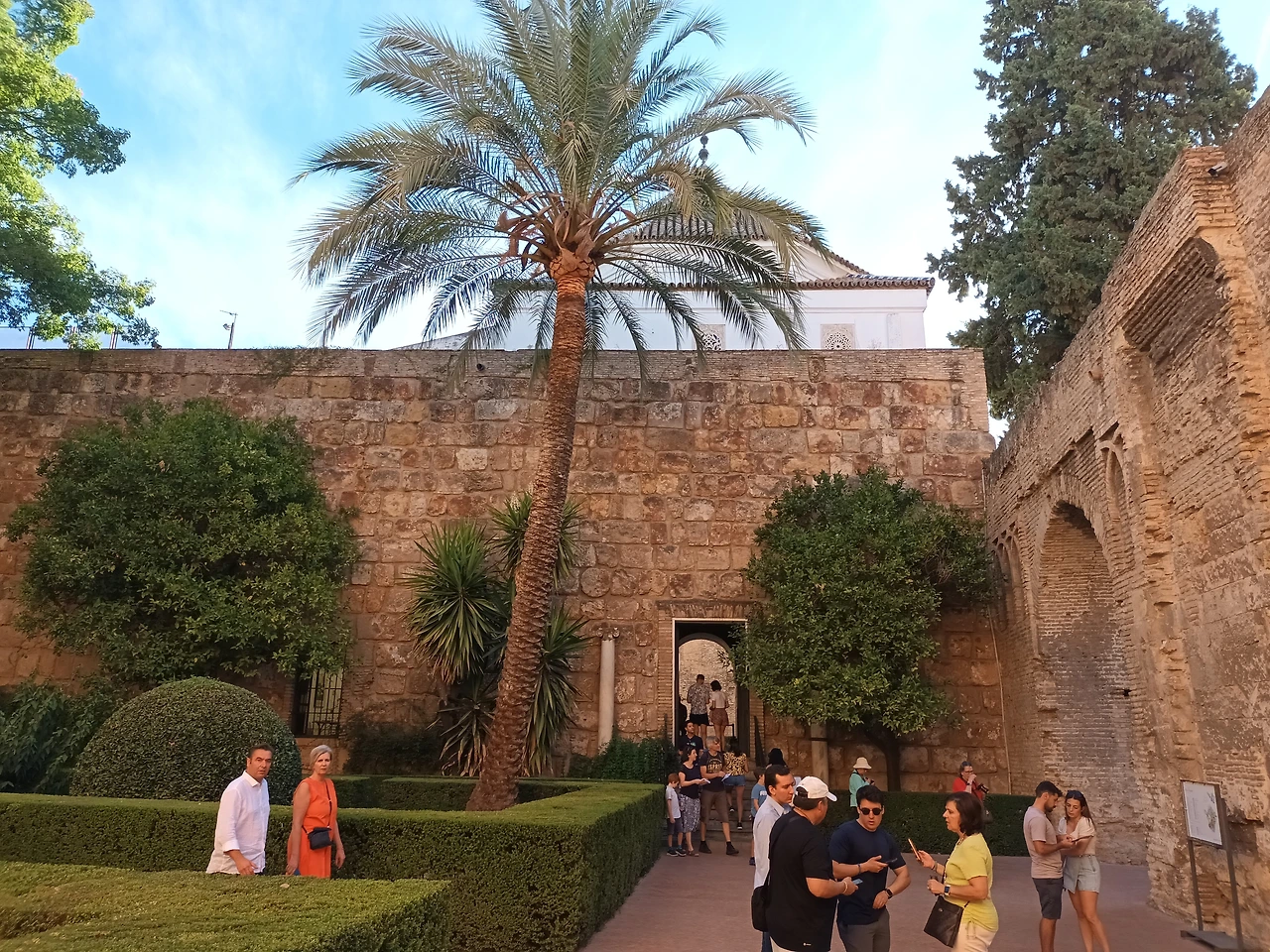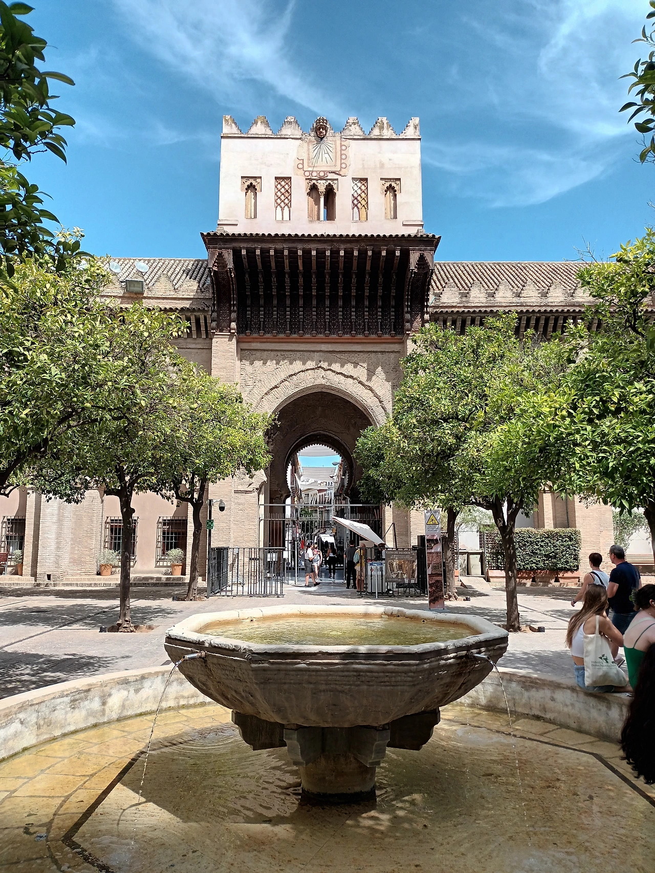 알카사르는 성안에 아름다운 정원이 있는 곳으로 아랍인들이 지배하던 시절의 흔적이 많이 남아 있었다. 걸어가는 길에 세비야 시청, 세비야 성당도 지나갔고, 오전 9시에 문을 열자 줄을 서서 바로 입장하였다. 아침에 방문하기를 잘했다는 생각이 들었다. 적당한 수의 관광객들이 있었고, 날씨도 더워지기 전이어서 여유롭게 성 건물 안과 곳곳에 자리 잡은 아름다운 회교식 파티오를 감상하였다. 나오기 전에는 건물 밖에 있는 큰 야외 정원을 거닐었다. 공작새들도 정원을 걸어 다니는 것이 운치가 있었다. 세비야 성당은 알카사르에서 바로 앞에 위치했지만, 입장시간도 한 시간 넘게 남아 있고, 아침에 세 시간가량 걸었더니 피곤해져서 알카사르 안쪽 출구 가까이에 있는 노천카페에서 마실 것을 사가지고 휴식을 취하였다.