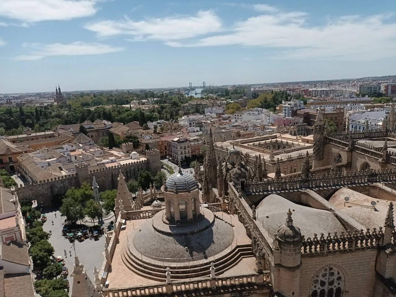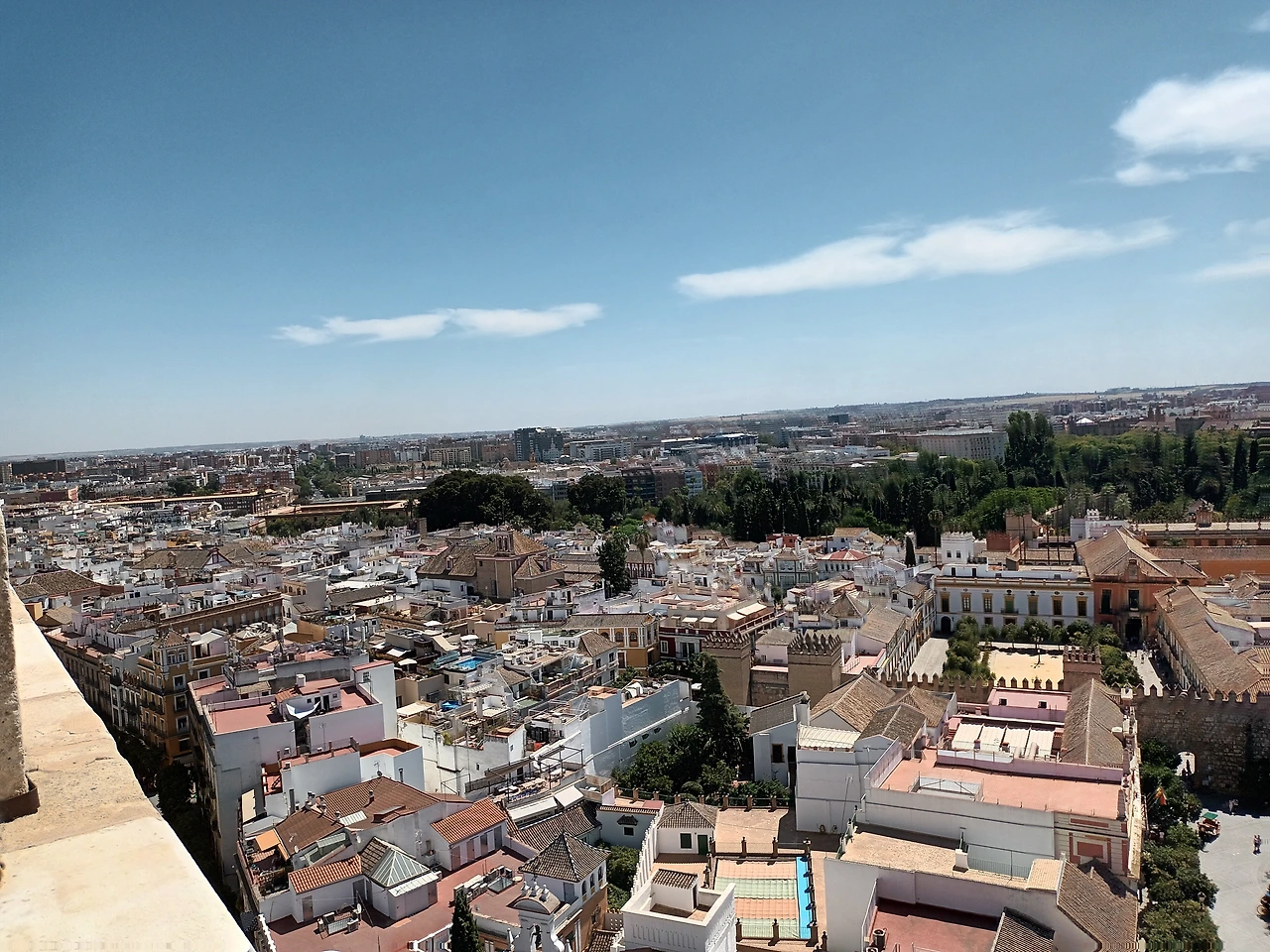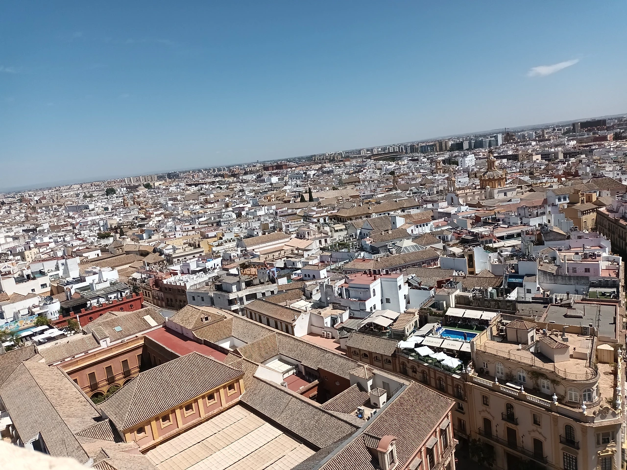 히랄다 탑은 세비야 성당에 붙어 있어서 세비야 성당 내부를 구경하고 연결되는 통로가 있어서 바로 올라갈 수 있었다. 계단이 없고 오르막 길이 나선형을 그리면서 탑 안에 나 있었다. 옛날에 왕이나 귀족들이 말을 타고 올라가도록 그렇게 만들었다고 한다. 히랄다 정상에 올라가니, 성당의 지붕과 함께 세비야의 전경이 멀리까지 펼쳐진 것이 보였다.