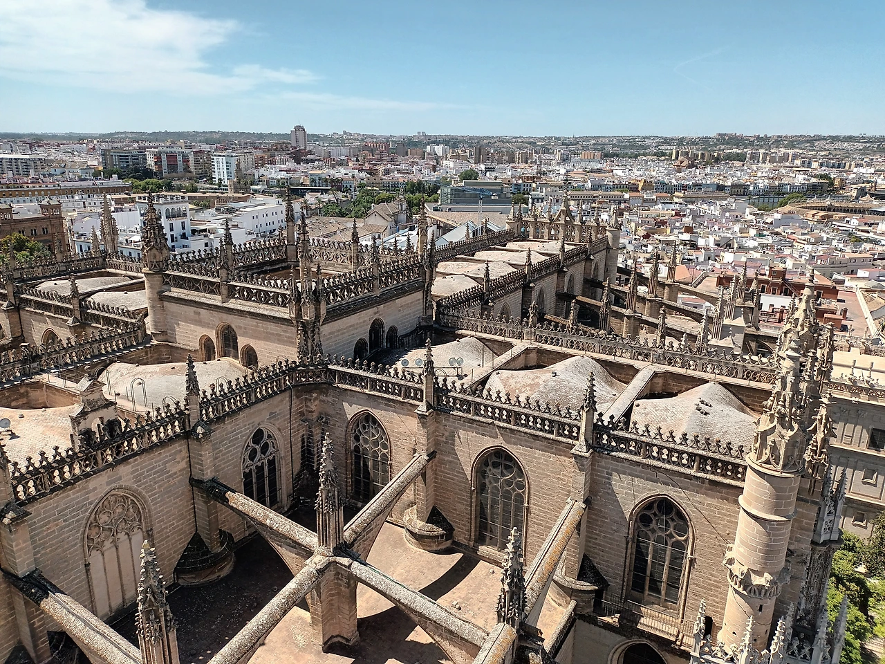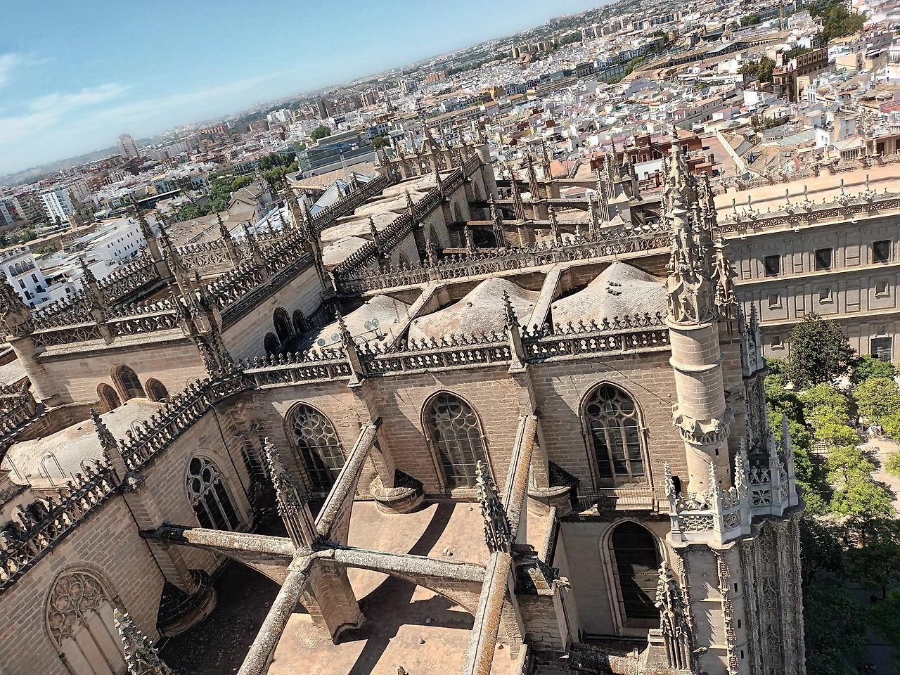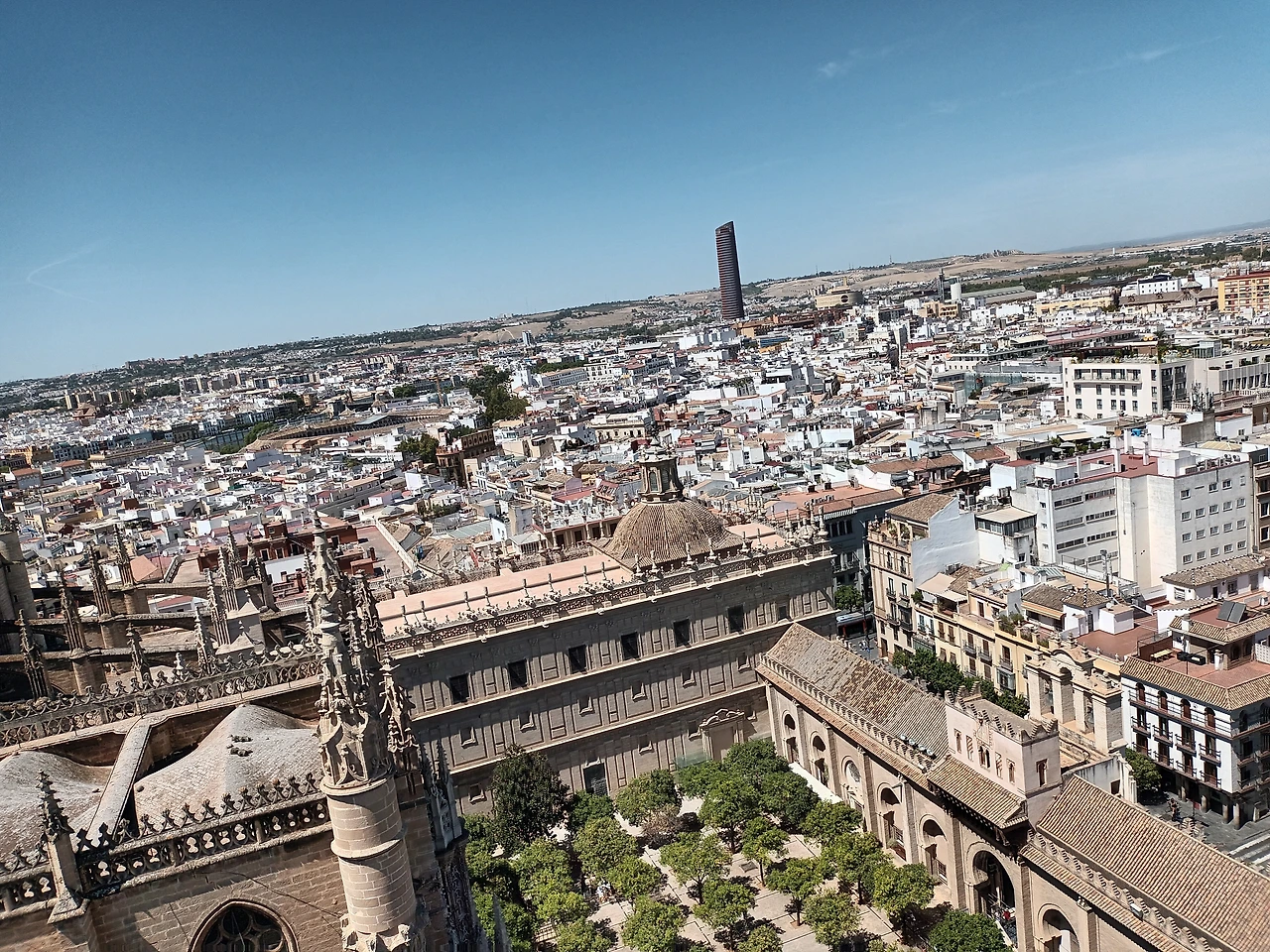 히랄다 탑은 세비야 성당에 붙어 있어서 세비야 성당 내부를 구경하고 연결되는 통로가 있어서 바로 올라갈 수 있었다. 계단이 없고 오르막 길이 나선형을 그리면서 탑 안에 나 있었다. 옛날에 왕이나 귀족들이 말을 타고 올라가도록 그렇게 만들었다고 한다. 히랄다 정상에 올라가니, 성당의 지붕과 함께 세비야의 전경이 멀리까지 펼쳐진 것이 보였다.