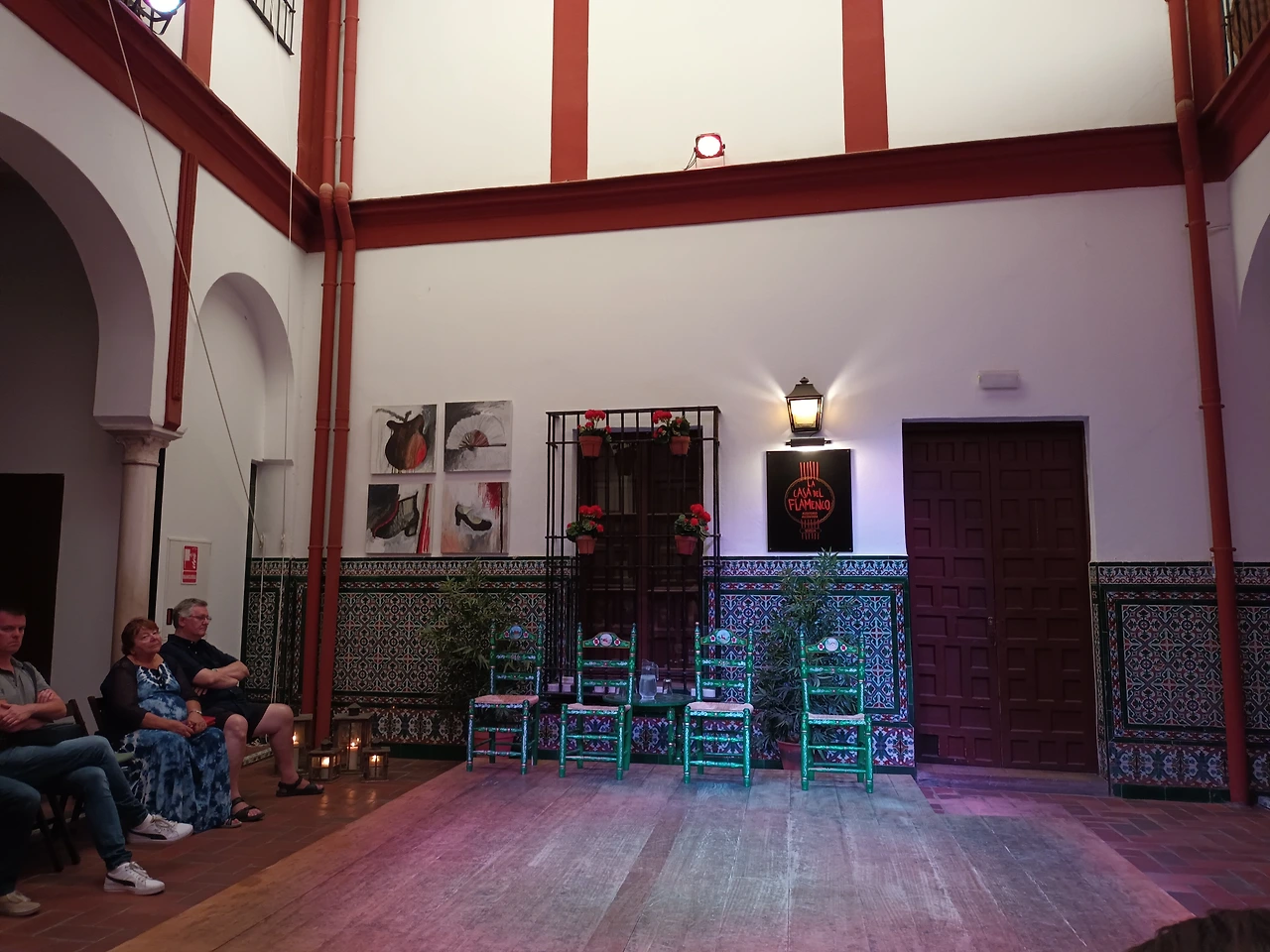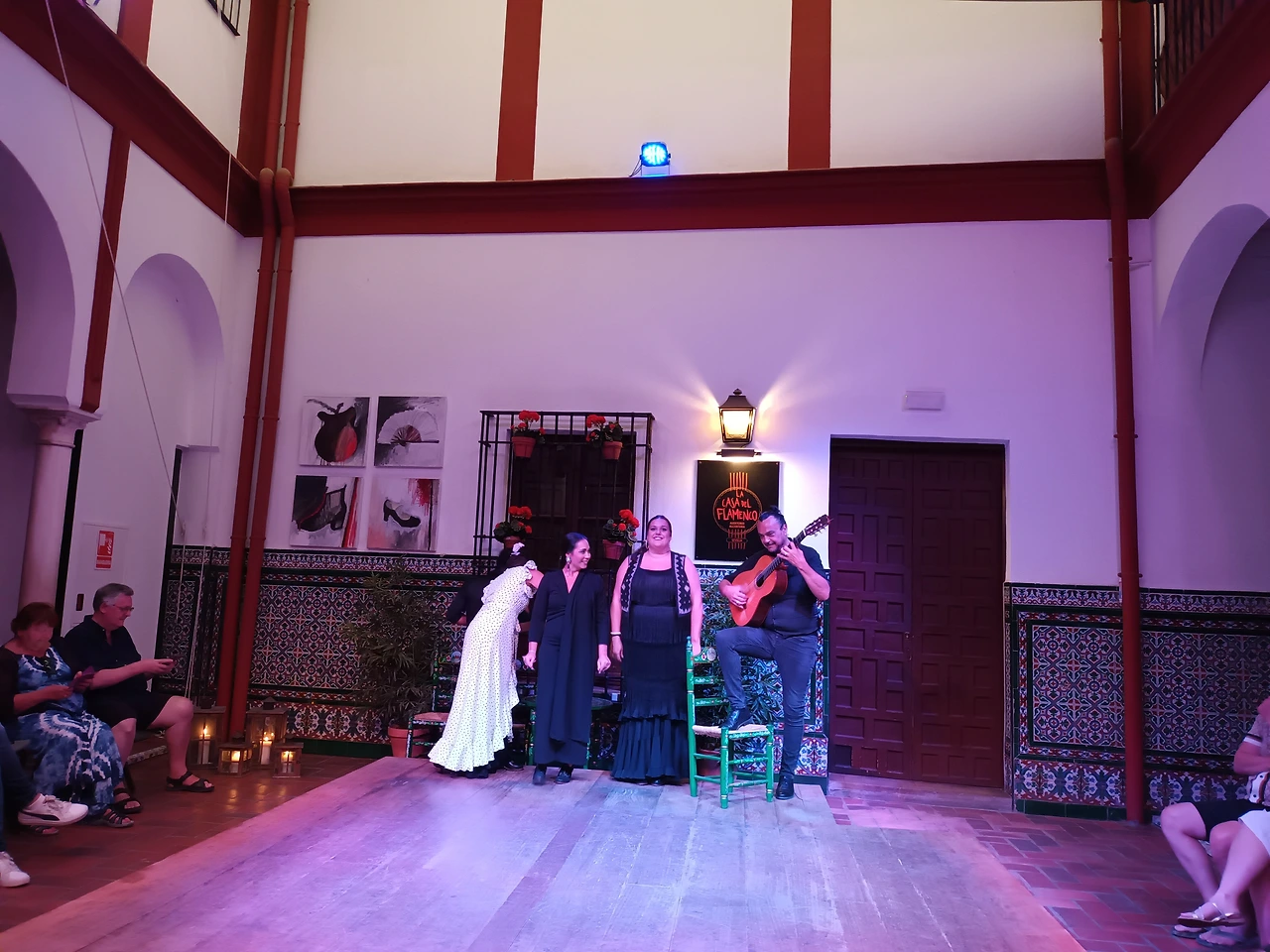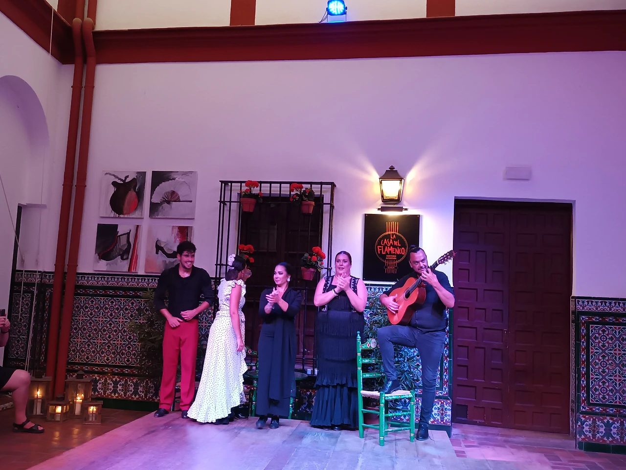 저녁에는 7시에 예약해 둔 플라멩코 공연장인 '라 까사 델 플라멩코'(La Casa del Flamenco)로 갔다. 건물 안에 위치한 실내 파티오 같은 공간에서 공연을 하였고 좌석배치도 어느 자리에 앉아도 무대를 잘 볼 수 있도록 계단식 삼열의 배열이었다. 어제 봤던 대형극장의 아쉬운 공연 공간과는 비교가 안 될 정도로 훌륭했다. 플라멩코 공연장들의 공연은 일률적인 내용이 아니고, 공연장들은 각각 자기들만의 내용과 특징이 있다는 것을 알 수 있었다. 오늘 공연은 남녀 간의 사랑이 주제가 아닐까 싶을 정도로 커플 댄스 형식이 여러 번 등장했고 기타 소리 또한 이전 공연장 보다 상대적으로 감미로웠다. 가수들은 두 명이 나와서 어느 부분은 음역대를 달리 해서 화음을 이루며 노래를 하였다. 춤 또한 훌륭하여, 기타 연주와 노래와 함께 세 가지 요소가 완벽히 조화를 이루었다. 일어나서 손뼉 친 첫 공연이었다.