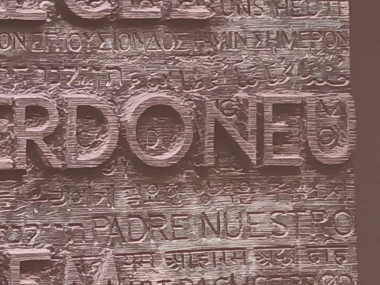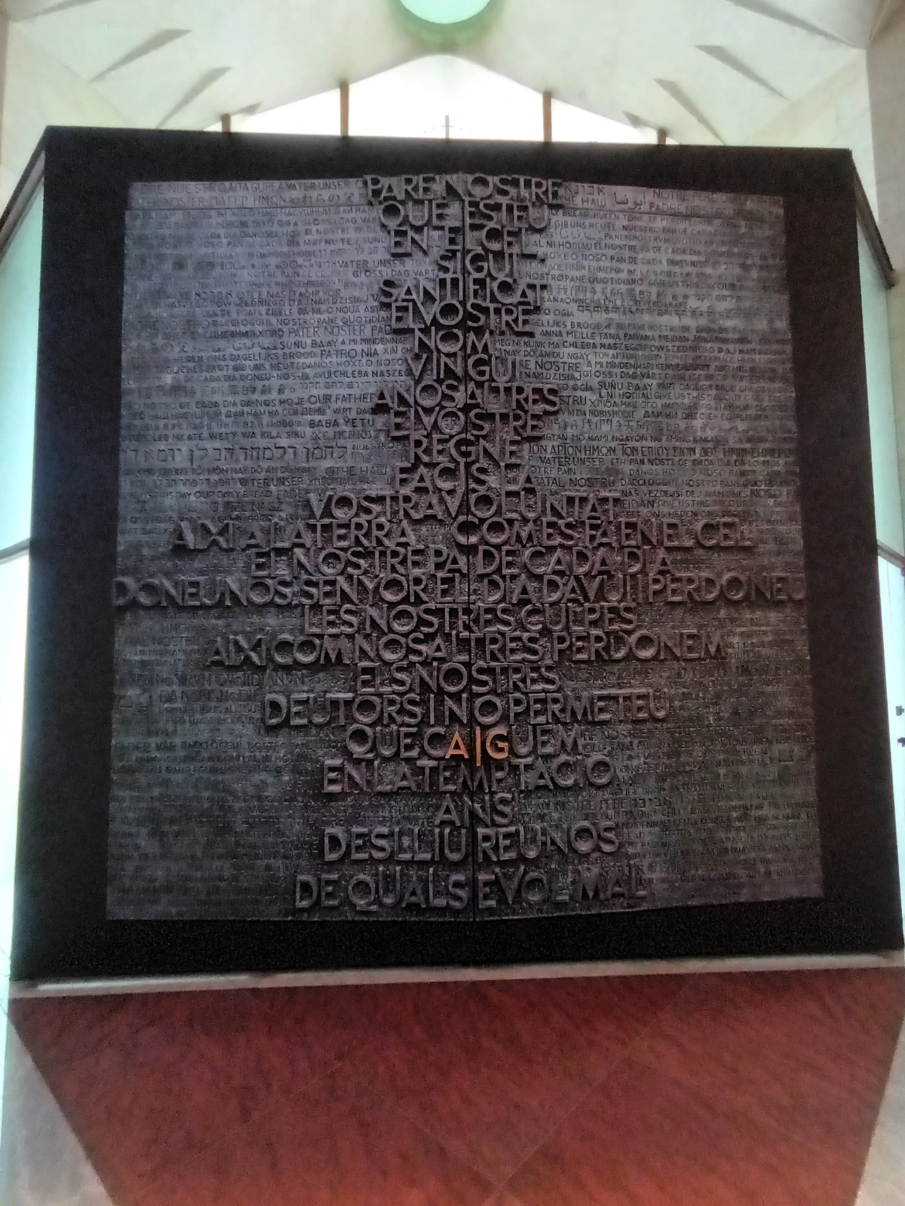 완공 후에 성당내부로 들어가는 정문으로 사용될 곳에 성경구절이 여러 나라 말로 적혀 있었다. 한국어도 있었고, "오늘 우리에게 필요한 양식을 주옵소서"라고 쓰여 있었다. 서쪽 유리창에는 각 나라의 가톨릭 성인들이 적혀 있었는데, KIM이라는 글자도 찾을 수 있었다. 우리나라 최초로 신부님이 되었고 구한말에 순교한 김대건 신부님이 아닐까 추측이 되었다.
