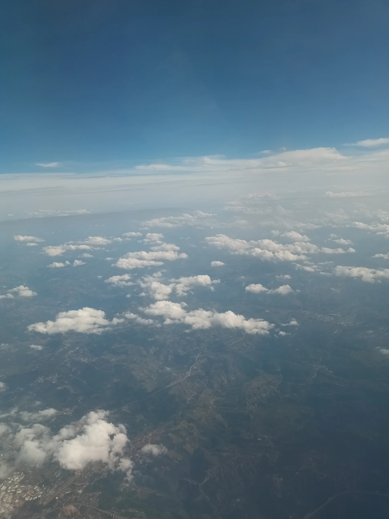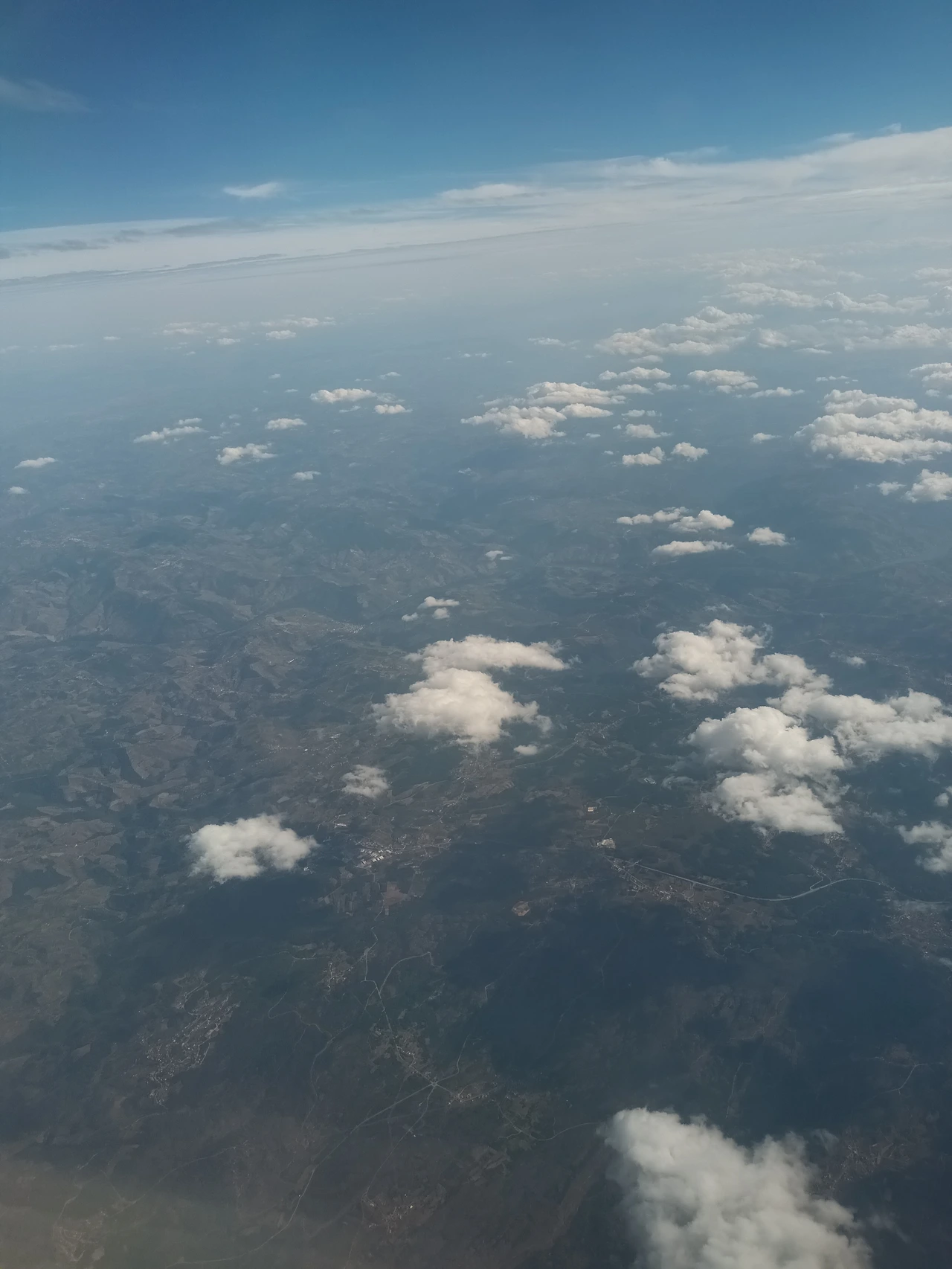 이렇게 아름다운 포르투갈의 마지막 하늘에 작별을 고하고, 공항 건물 안으로 들어가, 체크인 검색대를 통과해서 탑승구까지 계속 이동하였다. 마드리드로 가는 에어 유로파 항공기 안으로 들어가자 벌써 승객들이 가득했다. 이번에는 창가 쪽 좌석이어서 입구에 앉은 승객에게 양해를 구하고 자리에 앉았다. 손목에 찬 시계의 바늘을 한 시간 늦게 다시 맞추었다. 스페인은 서머타임이 적용되고 있어서 포르투갈보다 한 시간이 빠른 것 같았다. 비행기는 오후 4시경에 포르투갈의 포루투 공항을 이륙하였고, 상승하는 과정에서 대서양이 보였다. 서쪽으로 선회하더니, 육지 쪽으로 방향을 돌렸다. 오늘은 날씨가 맑고, 창가 좌석에 앉아서 비행기 창을 통해 유럽의 하늘과 지형들을 잘 관찰할 수 있었다.