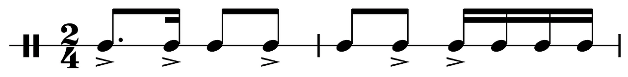 메렝게 음악의 기본 리듬은 아래 리듬 악보를 참고하시기 바랍니다. 물론 변형 리듬도 있지만, 기본 리듬은 아래와 같습니다.