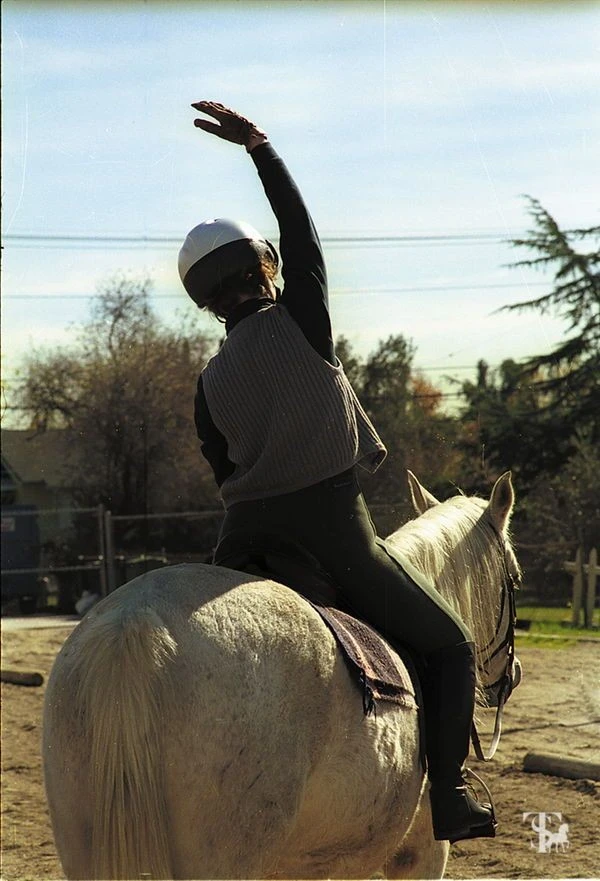 그 후 발끝을 자유롭게 움직이며 발목 운동을 해봅니다. 발목 관절이 훨씬 유연해져 말에게 박차를 주거나 종아리를 써서 배를 누르기가 수월해집니다. 심지어 운동하다가 등자 쇠에서 발이 빠졌을 때 다시 끼우는 데도 도움이 됩니다. 상체 운동은 목과 어깨 위주로 합니다. 어깨를 좌우로 번갈아 돌려주거나 8자 모양으로 회전시키면 긴장을 완화시킬 수 있습니다. 이렇게 하면 낙마를 해도 덜 다치는 것 같습니다. 단 어깨 운동을 할 때는 고삐를 한 손에 쥐고 다른 쪽 어깨를 풀어줘야 하며 그렇지 않을 경우에는 고삐를 놓칠 수도 있으니 주의해야 합니다.