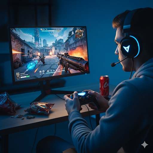 그는 게임 실력이 형편없었지만, 옆에서 친구들이 지켜보고 있음에도 불구하고 전혀 부끄러워하거나 판단 받는다는 느낌을 받지 않는 듯했습니다. 오히려 그는 활짝 웃으며 오로지 게임 속의 적들을 처치하는 데만 몰두하고 있었습니다.