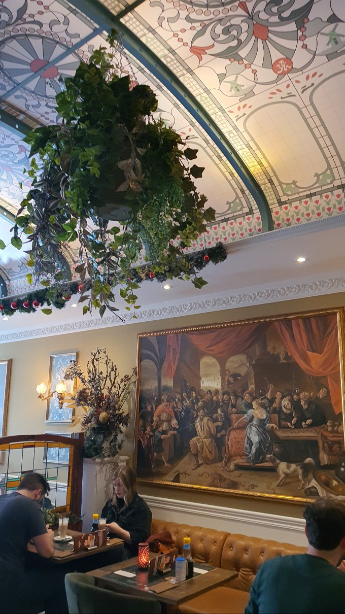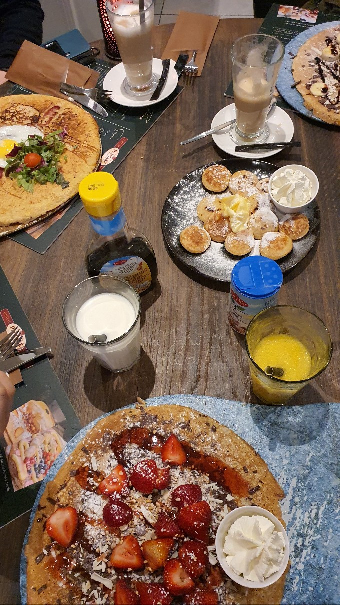 맛있기로 소문난 팬케이크 집에 들렀다. 천장화와 벽화가 예사롭지 않아 유서 깊은 가게라는 것이 피부에 와닿았다.