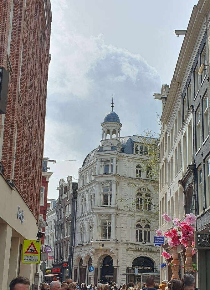 딸 친구는 쇼핑을 하러 가고 딸과 사위, 작은 손녀와 감자튀김을 먹으며 암스테르담 중앙역 앞 가장 사람이 많이 모인다는 거리로 갔다. 킹스데이에 입을 네덜란드를 상징하는 오렌지 색 티셔츠와 머리띠를 샀다. 맥도널드, 스타벅스 등 낯익은 간판이 보여 반가웠다. 골목으로 접어들자 건물 모양이 다 다르고 건물 꼭대기에는 도르래 고리가 달려있었다. 중세 때 네덜란드는 현관문 넓이에 따라 세금을 부과했다. 절세하려고 집 지을 때 문 폭을 좁게 짓고 피아노나 커다란 가구 운반하기 위해 건물 꼭대기에 도르래를 설치했다.