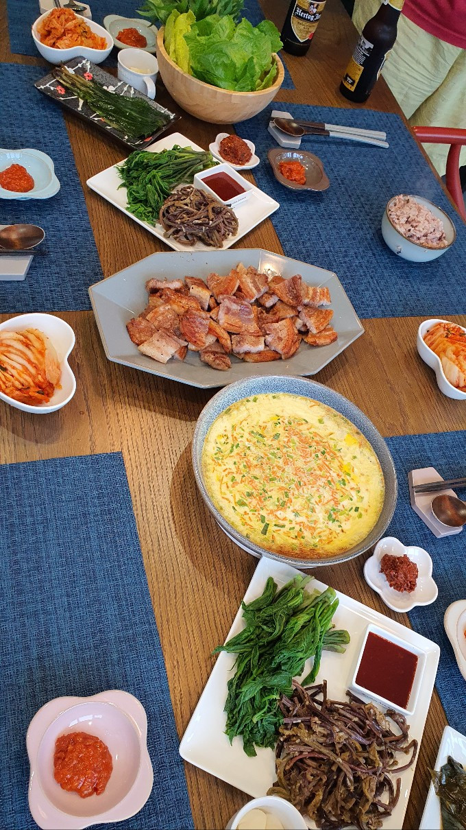 저녁은 큰손녀가 유별나게 좋아하는 한식을 먹기로 했다. 손 빠른 딸은 금방 시원한 콩나물국과 계란찜을 만들고 네덜란드에서 뜯어 담갔다는 명이나물 장아찌를 내왔다. 사위가 그릴에 돼지고기를 굽고 내가 가져온 제주 고사리를 불려 볶고 데친 엄나무 순과 황석어젓 무침을 곁들여 푸짐한 저녁상을 차렸다.