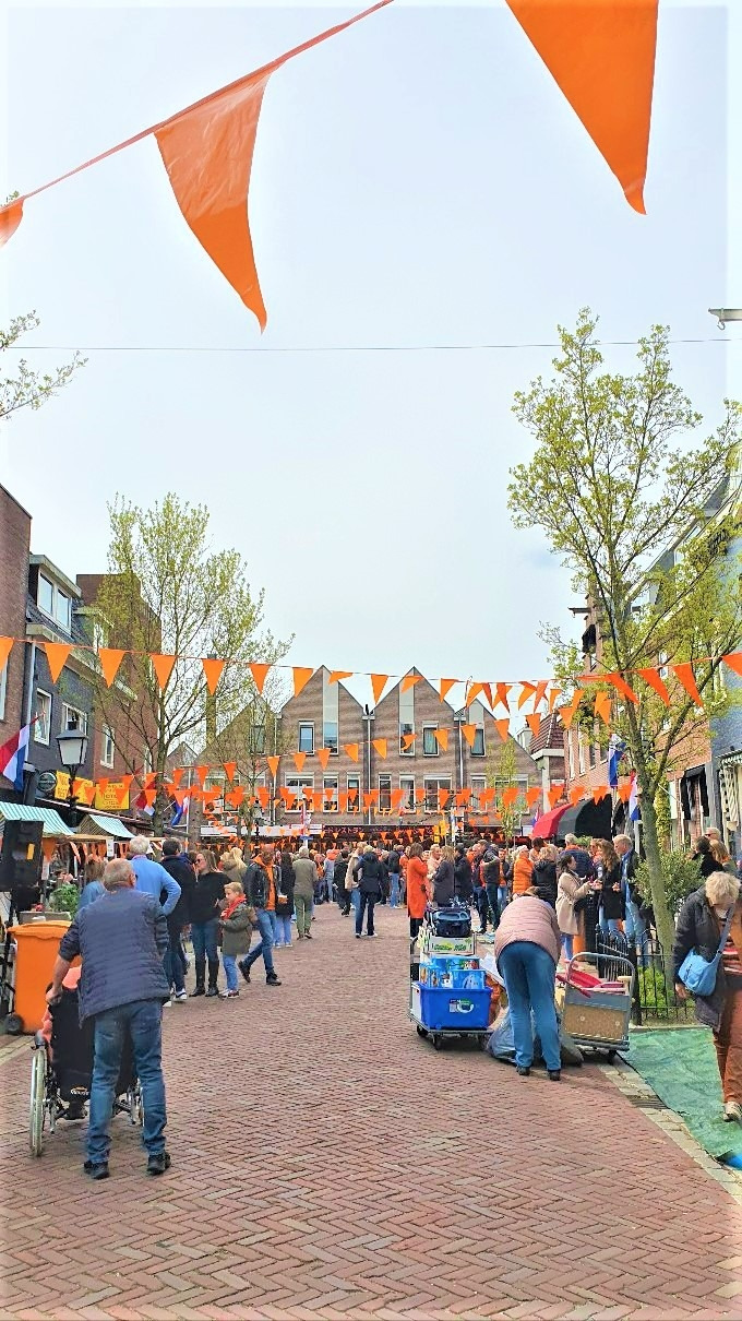 4월 27일은 국왕 생일을 기념하는 킹스 데이로 공휴일이라 집집마다 국기가 걸렸다. 사람들은 네덜란드 상징 색인 오렌지색 티셔츠와 목걸이로 치장하고 거리로 쏟아져 나왔다. 작은손녀는 전날 만든 쿠키를 팔러 친구들과 암스테르담 중심가로 나가고 딸 내외와 구시가지 중심지 암스텔빈 기차역 부근으로 갔다. 오렌지색 줄 깃발이 나풀거리고 쿵쿵 땅이 울릴 만큼 음악 소리가 커서 저절로 어깨가 들썩거렸다.