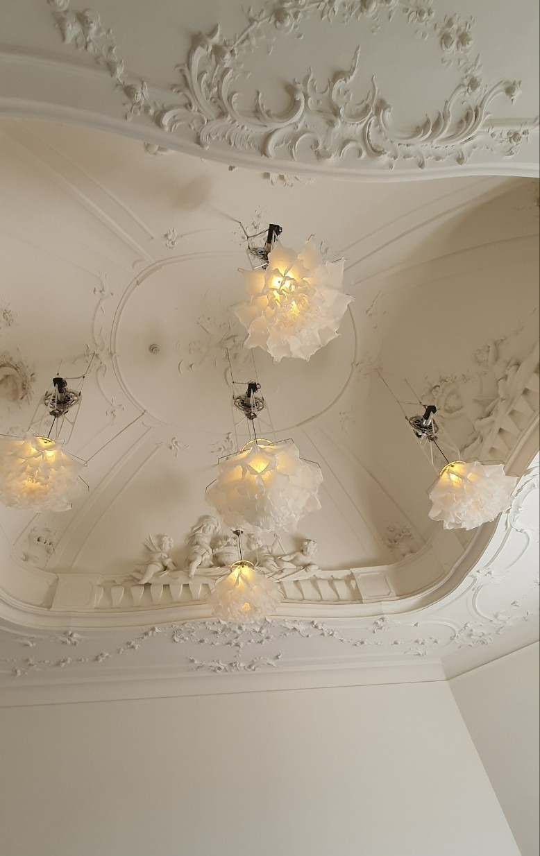 옆 공간으로 들어갔다. 흰 바탕에 아름다운 문양을 넣은 로코코 양식의 화사한 천장에서 여러 개의 도르래와 톱니바퀴가 맞물리며 움직였다. 하얀 꽃송이가 제각각 오르내리며 활짝 펴졌다 오므라져 관람객의 눈길과 마음을 사로잡았다.