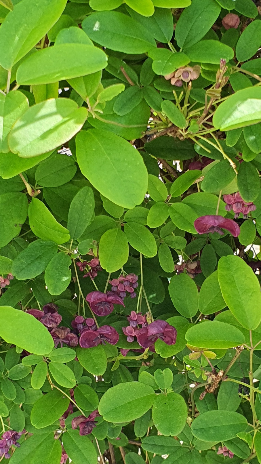 - 담장을 빽빽하게 휘감은 으름 넝쿨에 달린 보라색 꽃 -