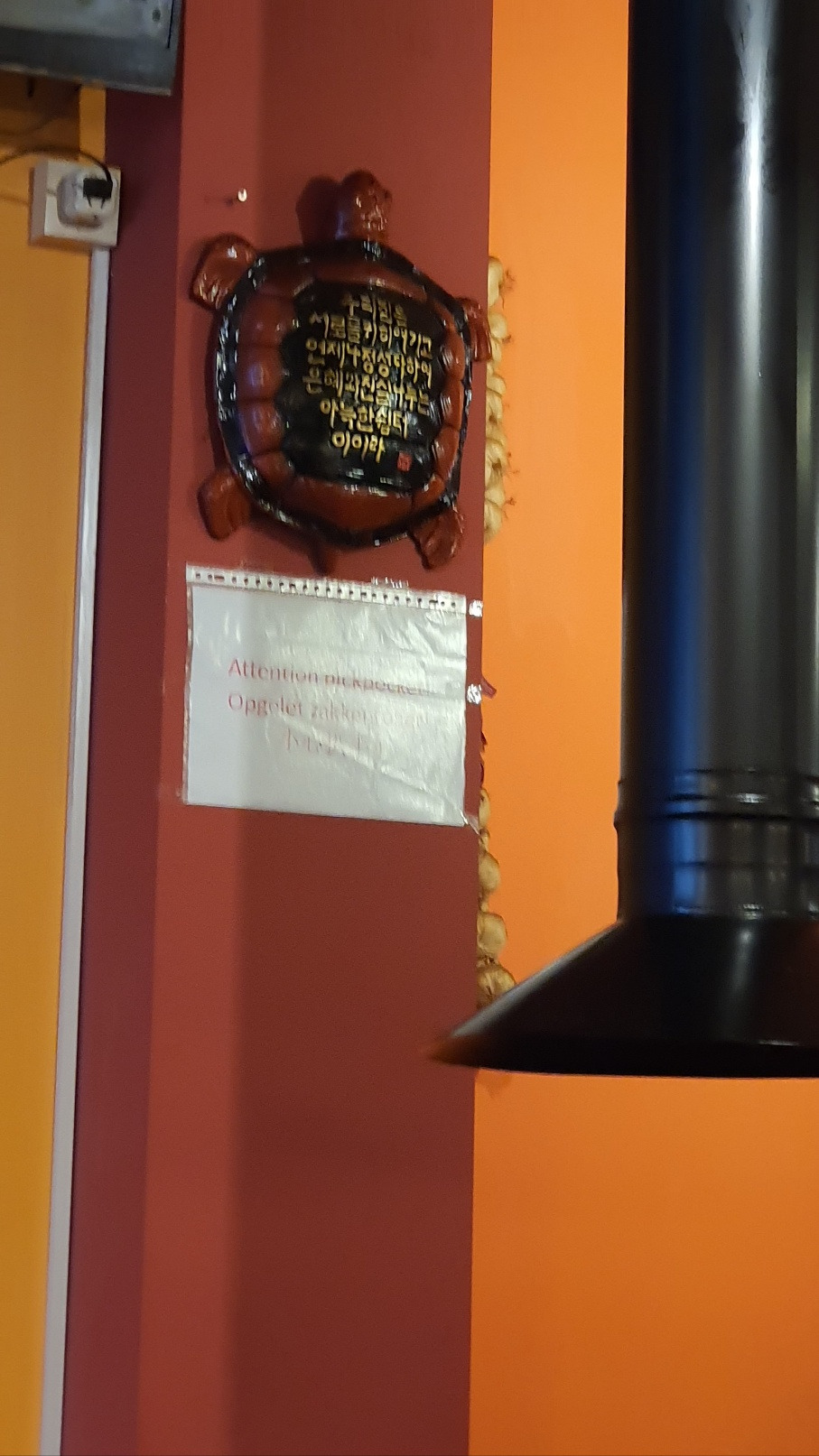 그런데 어째 둘러보면 둘러볼수록 좀! 게다가 여기저기 일본 인형과 술병도 있어 기분 나빴다. 도대체 이 식당 정체성이 뭐야? 김치의 집이라는 간판만 보고 우리 동포가 브뤼셀까지 진출했구나 싶어 반가웠었는데 속았다는 기분이 들었다. 게다가 주문을 받으러 온 아가씨, 주인, 주방장은 모두 중국인이었다.