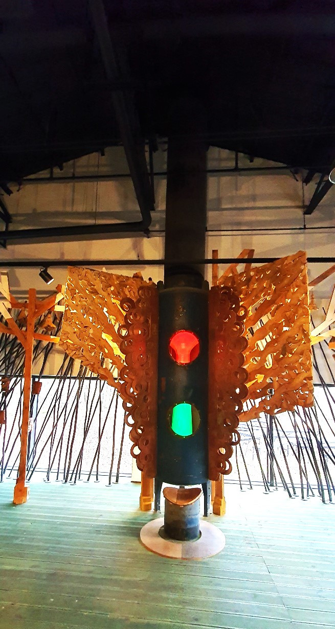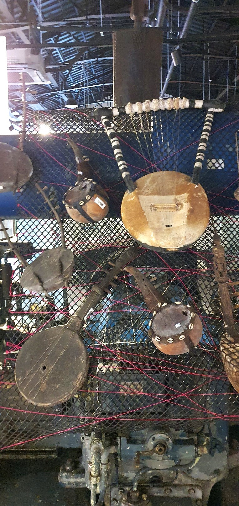 그물에 걸린 각종 악기들과 탄광 기계가 잘 어울린다.