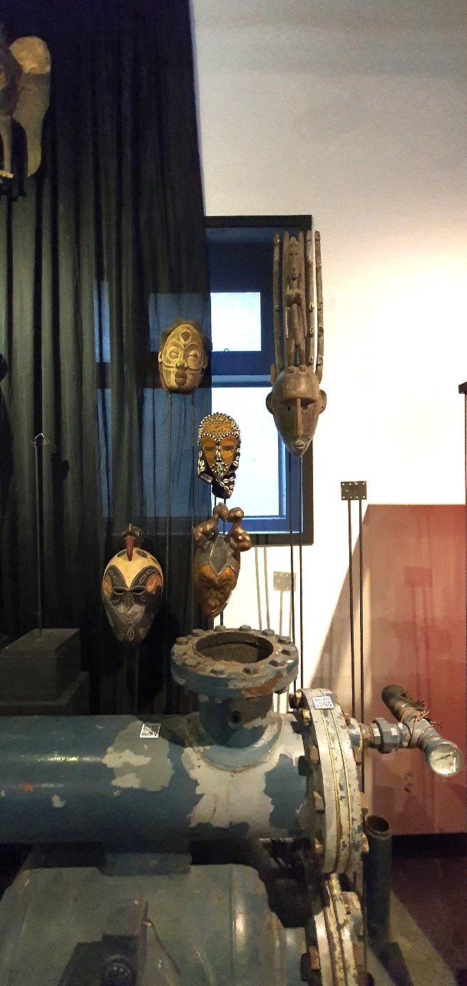 칠이 벗겨지고 낡은 입수관과 잘 어울리는 마스크들