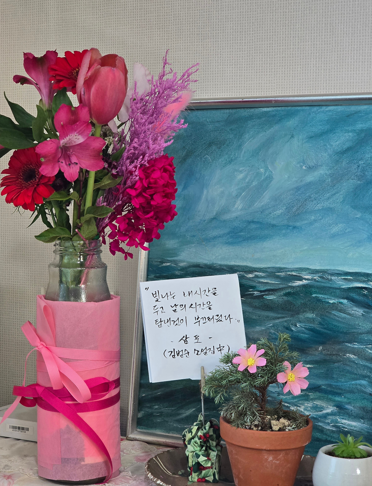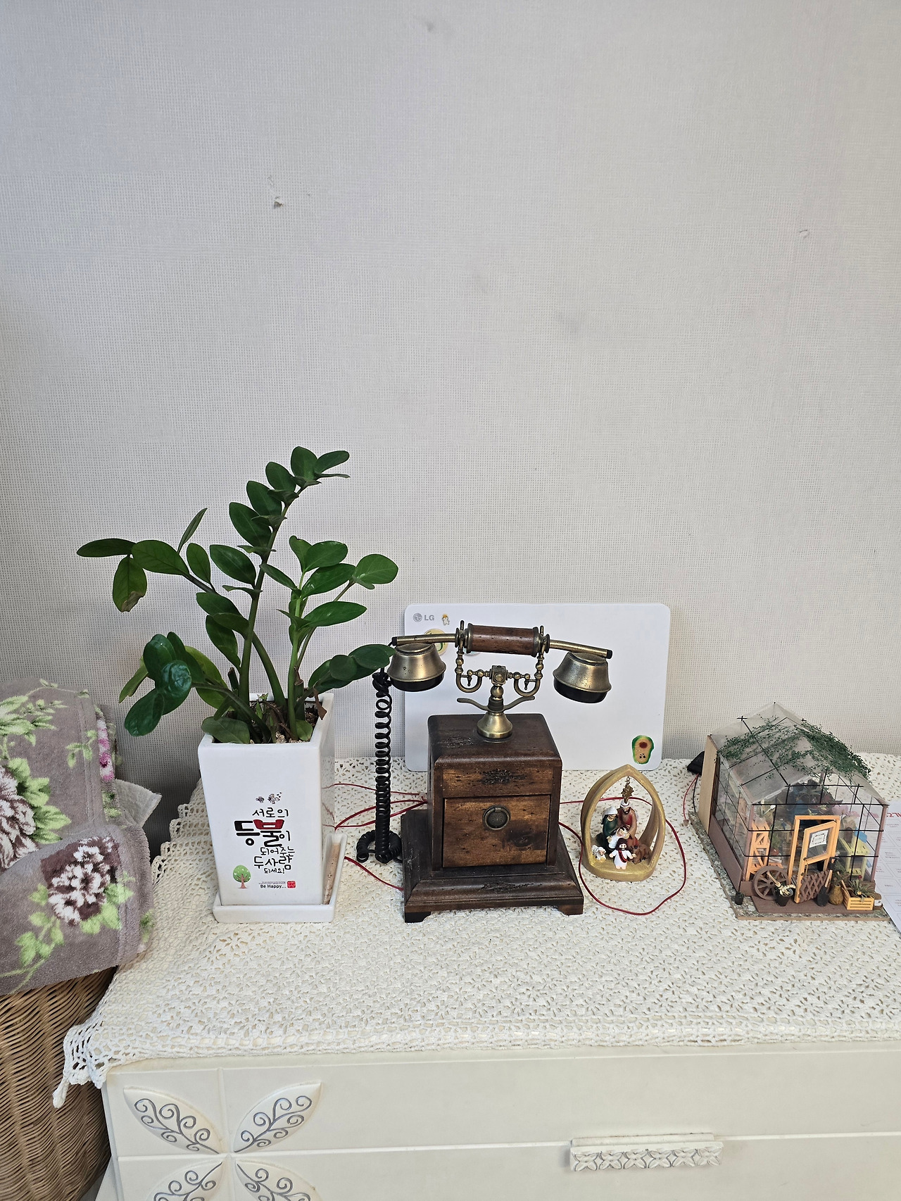 전화기와 화분과 소품의 아지자기한 조화