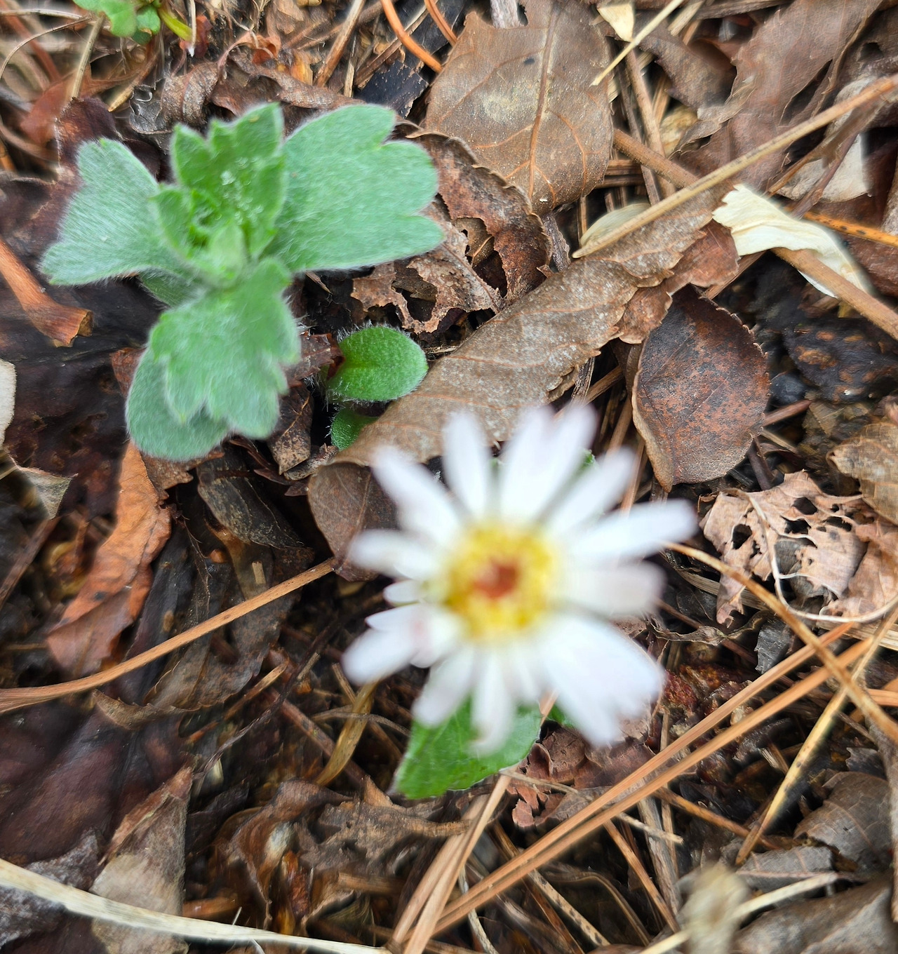 커다란 가랑잎이 꽃을 덮고 있어 한쪽은 제대로 피지 못했다. 검색해 보니 솜나물꽃이었다.